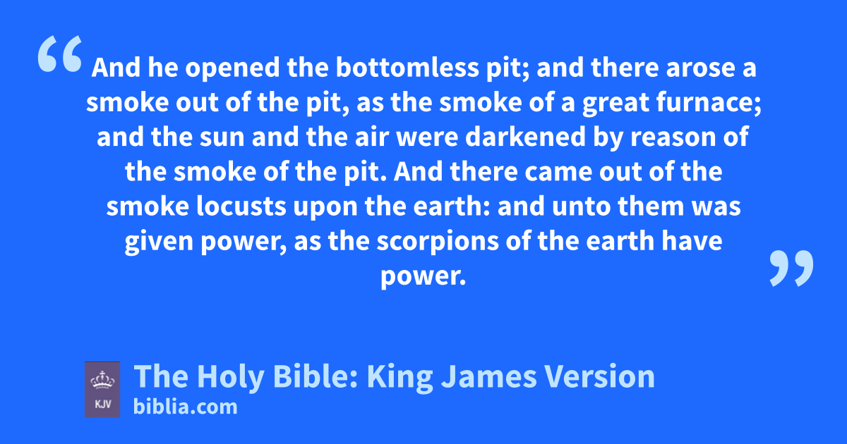 1 And the fifth angel sounded, and I saw a star fall from heaven unto the earth: and to him was given the key of the bottomless pit. 2 And he opened the bottomless pit; and there arose a smoke out of the pit, as the smoke of a great furnace; and the sun and the air were darkened by reason of the smoke of the pit. 3 And there came out of the smoke locusts upon the earth: and unto them was given power, as the scorpions of the earth have power. 4 And it was commanded them that they should not hurt the grass of the earth, neither any green thing, neither any tree; but only those men which have not the seal of God in their foreheads. 5 And to them it was given that they should not kill them, but that they should be tormented five months: and their torment was as the torment of a scorpion, when he striketh a man. 6 And in those days shall men seek death, and shall not find it; and shall desire to die, and death shall flee from them. 7 And the shapes of the locusts were like unto horses prepared unto battle; and on their heads were as it were crowns like gold, and their faces were as the faces of men. 8 And they had hair as the hair of women, and their teeth were as the teeth of lions. 9 And they had breastplates, as it were breastplates of iron; and the sound of their wings was as the sound of chariots of many horses running to battle. 10 And they had tails like unto scorpions, and there were stings in their tails: and their power was to hurt men five months. 11 And they had a king over them, which is the angel of the bottomless pit, whose name in the Hebrew tongue is Abaddon, but in the Greek tongue hath his name Apollyona. 12 One woe is past; and, behold, there come two woes more hereafter.