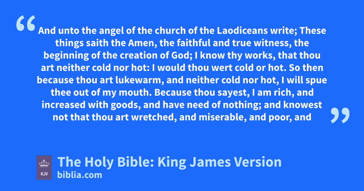 14 And unto the angel of the church of the Laodiceansa write; These things saith the Amen, the faithful and true witness, the beginning of the creation of God; 15 I know thy works, that thou art neither cold nor hot: I would thou wert cold or hot. 16 So then because thou art lukewarm, and neither cold nor hot, I will spue thee out of my mouth. 17 Because thou sayest, I am rich, and increased with goods, and have need of nothing; and knowest not that thou art wretched, and miserable, and poor, and blind, and naked: 18 I counsel thee to buy of me gold tried in the fire, that thou mayest be rich; and white raiment, that thou mayest be clothed, and that the shame of thy nakedness do not appear; and anoint thine eyes with eyesalve, that thou mayest see. 19 As many as I love, I rebuke and chasten: be zealous therefore, and repent. 20 Behold, I stand at the door, and knock: if any man hear my voice, and open the door, I will come in to him, and will sup with him, and he with me. 21 To him that overcometh will I grant to sit with me in my throne, even as I also overcame, and am set down with my Father in his throne. 22 He that hath an ear, let him hear what the Spirit saith unto the churches.