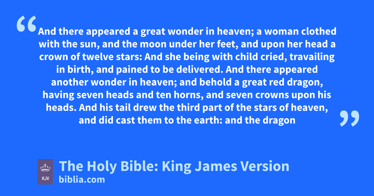 1 And there appeared a great wondera in heaven; a woman clothed with the sun, and the moon under her feet, and upon her head a crown of twelve stars: 2 And she being with child cried, travailing in birth, and pained to be delivered. 3 And there appeared another wonderb in heaven; and behold a great red dragon, having seven heads and ten horns, and seven crowns upon his heads. 4 And his tail drew the third part of the stars of heaven, and did cast them to the earth: and the dragon stood before the woman which was ready to be delivered, for to devour her child as soon as it was born. 5 And she brought forth a man child, who was to rule all nations with a rod of iron: and her child was caught up unto God, and to his throne. 6 And the woman fled into the wilderness, where she hath a place prepared of God, that they should feed her there a thousand two hundred and threescore days. 7 And there was war in heaven: Michael and his angels fought against the dragon; and the dragon fought and his angels, 8 And prevailed not; neither was their place found any more in heaven. 9 And the great dragon was cast out, that old serpent, called the Devil, and Satan, which deceiveth the whole world: he was cast out into the earth, and his angels were cast out with him. 10 And I heard a loud voice saying in heaven, Now is come salvation, and strength, and the kingdom of our God, and the power of his Christ: for the accuser of our brethren is cast down, which accused them before our God day and night. 11 And they overcame him by the blood of the Lamb, and by the word of their testimony; and they loved not their lives unto the death.