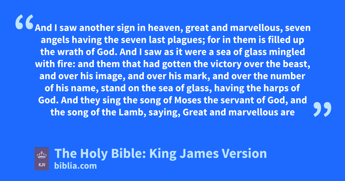 1 And I saw another sign in heaven, great and marvellous, seven angels having the seven last plagues; for in them is filled up the wrath of God. 2 And I saw as it were a sea of glass mingled with fire: and them that had gotten the victory over the beast, and over his image, and over his mark, and over the number of his name, stand on the sea of glass, having the harps of God. 3 And they sing the song of Moses the servant of God, and the song of the Lamb, saying, Great and marvellous are thy works, Lord God Almighty; just and true are thy ways, thou King of saintsa. 4 Who shall not fear thee, O Lord, and glorify thy name? for thou only art holy: for all nations shall come and worship before thee; for thy judgments are made manifest.