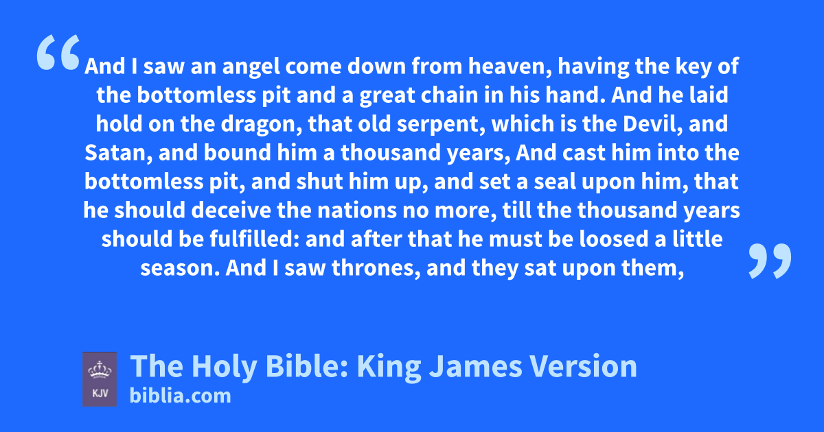 1 And I saw an angel come down from heaven, having the key of the bottomless pit and a great chain in his hand. 2 And he laid hold on the dragon, that old serpent, which is the Devil, and Satan, and bound him a thousand years, 3 And cast him into the bottomless pit, and shut him up, and set a seal upon him, that he should deceive the nations no more, till the thousand years should be fulfilled: and after that he must be loosed a little season. 4 And I saw thrones, and they sat upon them, and judgment was given unto them: and I saw the souls of them that were beheaded for the witness of Jesus, and for the word of God, and which had not worshipped the beast, neither his image, neither had received his mark upon their foreheads, or in their hands; and they lived and reigned with Christ a thousand years. 5 But the rest of the dead lived not again until the thousand years were finished. This is the first resurrection. 6 Blessed and holy is he that hath part in the first resurrection: on such the second death hath no power, but they shall be priests of God and of Christ, and shall reign with him a thousand years. 7 And when the thousand years are expired, Satan shall be loosed out of his prison, 8 And shall go out to deceive the nations which are in the four quarters of the earth, Gog and Magog, to gather them together to battle: the number of whom is as the sand of the sea. 9 And they went up on the breadth of the earth, and compassed the camp of the saints about, and the beloved city: and fire came down from God out of heaven, and devoured them. 10 And the devil that deceived them was cast into the lake of fire and brimstone, where the beast and the false prophet are, and shall be tormented day and night for ever and ever.