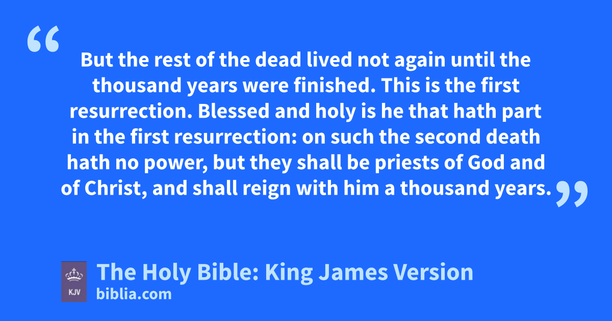 1 And I saw an angel come down from heaven, having the key of the bottomless pit and a great chain in his hand. 2 And he laid hold on the dragon, that old serpent, which is the Devil, and Satan, and bound him a thousand years, 3 And cast him into the bottomless pit, and shut him up, and set a seal upon him, that he should deceive the nations no more, till the thousand years should be fulfilled: and after that he must be loosed a little season. 4 And I saw thrones, and they sat upon them, and judgment was given unto them: and I saw the souls of them that were beheaded for the witness of Jesus, and for the word of God, and which had not worshipped the beast, neither his image, neither had received his mark upon their foreheads, or in their hands; and they lived and reigned with Christ a thousand years. 5 But the rest of the dead lived not again until the thousand years were finished. This is the first resurrection. 6 Blessed and holy is he that hath part in the first resurrection: on such the second death hath no power, but they shall be priests of God and of Christ, and shall reign with him a thousand years. 7 And when the thousand years are expired, Satan shall be loosed out of his prison, 8 And shall go out to deceive the nations which are in the four quarters of the earth, Gog and Magog, to gather them together to battle: the number of whom is as the sand of the sea. 9 And they went up on the breadth of the earth, and compassed the camp of the saints about, and the beloved city: and fire came down from God out of heaven, and devoured them. 10 And the devil that deceived them was cast into the lake of fire and brimstone, where the beast and the false prophet are, and shall be tormented day and night for ever and ever.