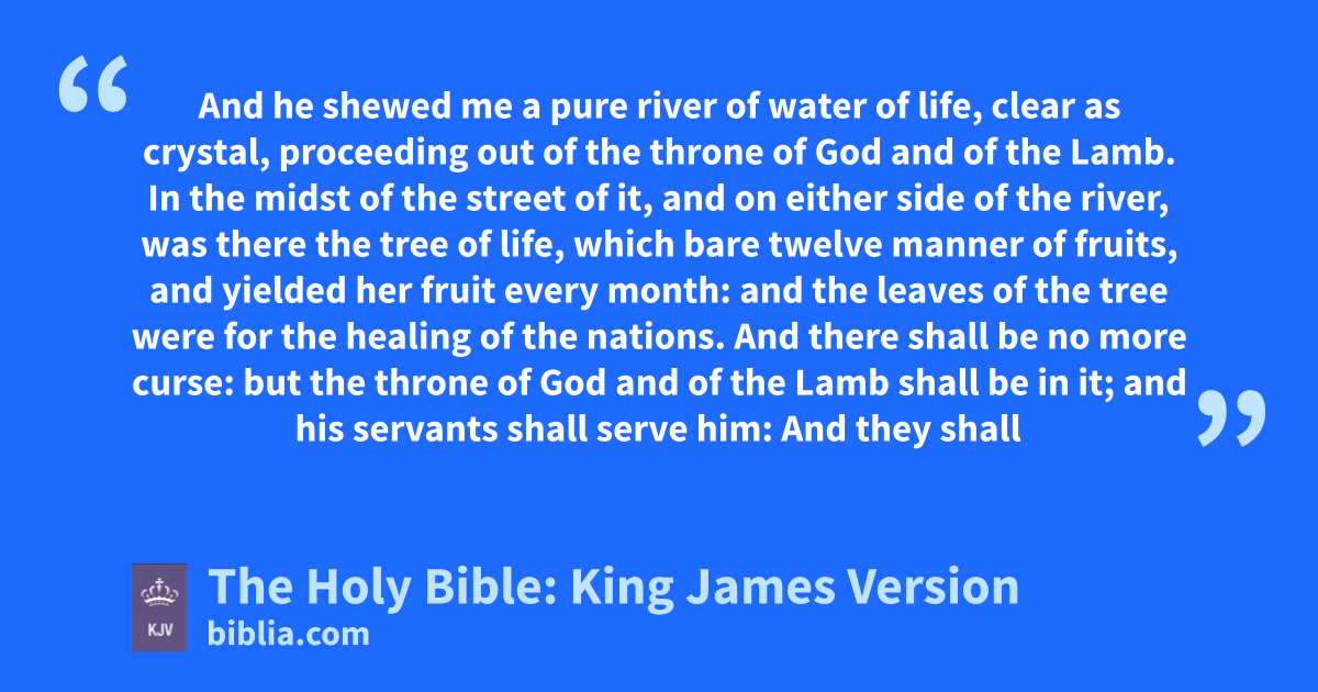 1 And he shewed me a pure river of water of life, clear as crystal, proceeding out of the throne of God and of the Lamb. 2 In the midst of the street of it, and on either side of the river, was there the tree of life, which bare twelve manner of fruits, and yielded her fruit every month: and the leaves of the tree were for the healing of the nations. 3 And there shall be no more curse: but the throne of God and of the Lamb shall be in it; and his servants shall serve him: 4 And they shall see his face; and his name shall be in their foreheads. 5 And there shall be no night there; and they need no candle, neither light of the sun; for the Lord God giveth them light: and they shall reign for ever and ever.