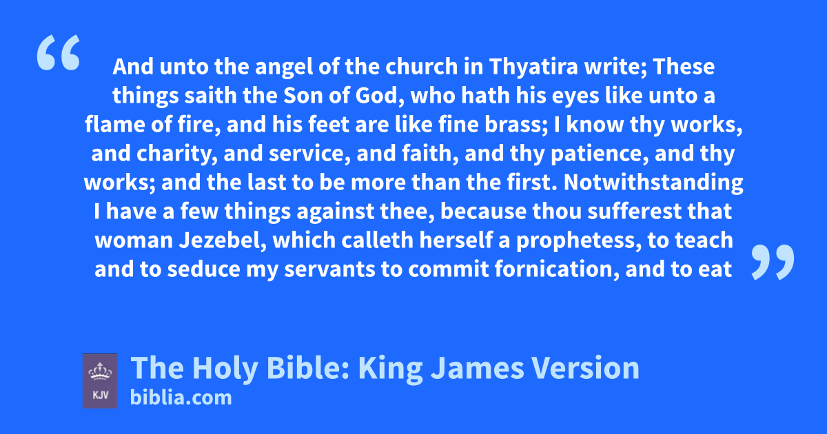 18 And unto the angel of the church in Thyatira write; These things saith the Son of God, who hath his eyes like unto a flame of fire, and his feet are like fine brass; 19 I know thy works, and charity, and service, and faith, and thy patience, and thy works; and the last to be more than the first. 20 Notwithstanding I have a few things against thee, because thou sufferest that woman Jezebel, which calleth herself a prophetess, to teach and to seduce my servants to commit fornication, and to eat things sacrificed unto idols. 21 And I gave her space to repent of her fornication; and she repented not. 22 Behold, I will cast her into a bed, and them that commit adultery with her into great tribulation, except they repent of their deeds. 23 And I will kill her children with death; and all the churches shall know that I am he which searcheth the reins and hearts: and I will give unto every one of you according to your works. 24 But unto you I say, and unto the rest in Thyatira, as many as have not this doctrine, and which have not known the depths of Satan, as they speak; I will put upon you none other burden. 25 But that which ye have already hold fast till I come. 26 And he that overcometh, and keepeth my works unto the end, to him will I give power over the nations: 27 And he shall rule them with a rod of iron; as the vessels of a potter shall they be broken to shivers: even as I received of my Father. 28 And I will give him the morning star. 29 He that hath an ear, let him hear what the Spirit saith unto the churches.