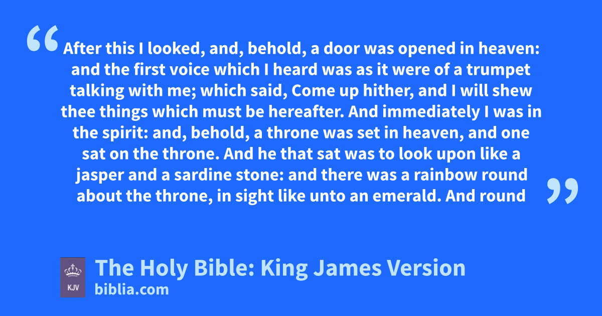 1 After this I looked, and, behold, a door was opened in heaven: and the first voice which I heard was as it were of a trumpet talking with me; which said, Come up hither, and I will shew thee things which must be hereafter. 2 And immediately I was in the spirit: and, behold, a throne was set in heaven, and one sat on the throne. 3 And he that sat was to look upon like a jasper and a sardine stone: and there was a rainbow round about the throne, in sight like unto an emerald. 4 And round about the throne were four and twenty seats: and upon the seats I saw four and twenty elders sitting, clothed in white raiment; and they had on their heads crowns of gold. 5 And out of the throne proceeded lightnings and thunderings and voices: and there were seven lamps of fire burning before the throne, which are the seven Spirits of God. 6 And before the throne there was a sea of glass like unto crystal: and in the midst of the throne, and round about the throne, were four beasts full of eyes before and behind. 7 And the first beast was like a lion, and the second beast like a calf, and the third beast had a face as a man, and the fourth beast was like a flying eagle.