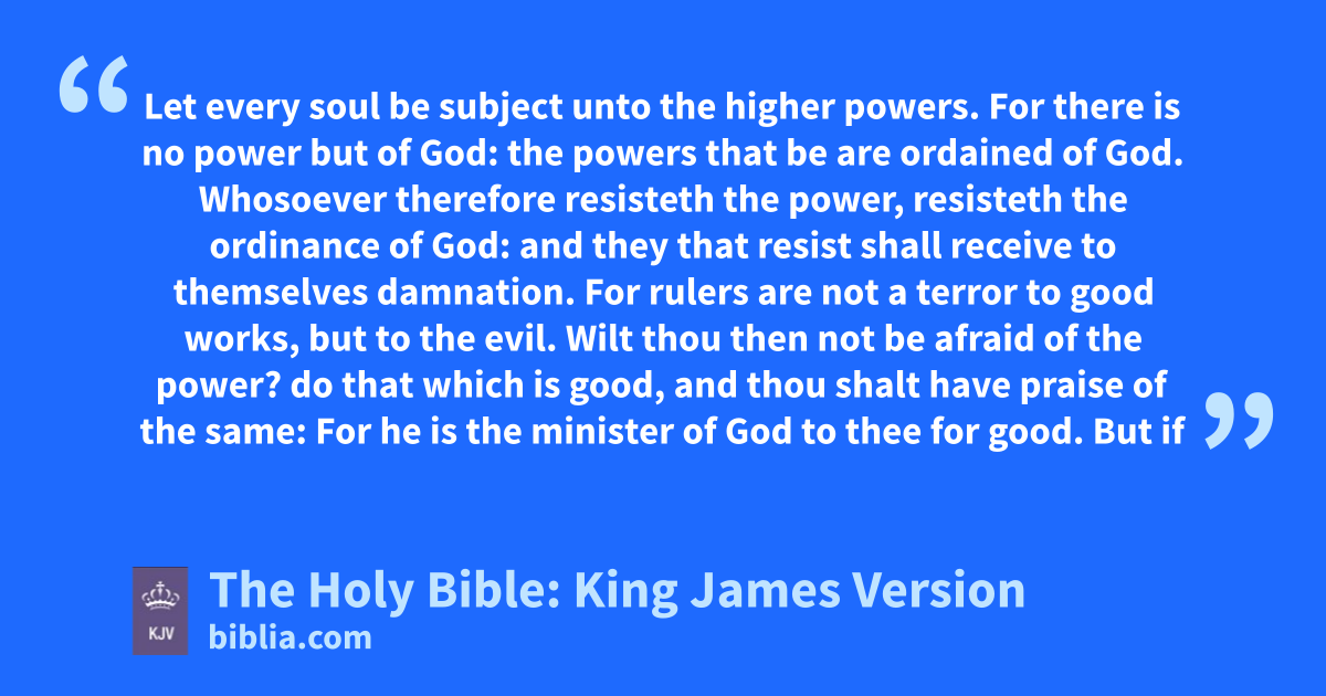 1 Let every soul be subject unto the higher powers. For there is no power but of God: the powers that be are ordaineda of God. 2 Whosoever therefore resisteth the power, resisteth the ordinance of God: and they that resist shall receive to themselves damnation. 3 For rulers are not a terror to good works, but to the evil. Wilt thou then not be afraid of the power? do that which is good, and thou shalt have praise of the same: 4 For he is the minister of God to thee for good. But if thou do that which is evil, be afraid; for he beareth not the sword in vain: for he is the minister of God, a revenger to execute wrath upon him that doeth evil. 5 Wherefore ye must needs be subject, not only for wrath, but also for conscience sake. 6 For for this cause pay ye tribute also: for they are God’s ministers, attending continually upon this very thing.