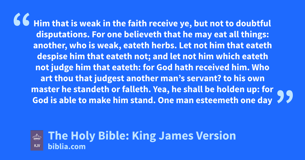 1 Him that is weak in the faith receive ye, but† nota to doubtful disputations. 2 For one believeth that he may eat all things: another, who is weak, eateth herbs. 3 Let not him that eateth despise him that eateth not; and let not him which eateth not judge him that eateth: for God hath received him. 4 Who art thou that judgest another man’s servant? to his own master he standeth or falleth. Yea, he shall be holden up: for God is able to make him stand. 5 One man esteemeth one day above another: another esteemeth every day alike. Let every man be fully persuadedb in his own mind. 6 He that regardethc the day, regardeth it unto the Lord; and he that regardeth not the day, to the Lord he doth not regard it. He that eateth, eateth to the Lord, for he giveth God thanks; and he that eateth not, to the Lord he eateth not, and giveth God thanks. 7 For none of us liveth to himself, and no man dieth to himself. 8 For whether we live, we live unto the Lord; and whether we die, we die unto the Lord: whether we live therefore, or die, we are the Lord’s. 9 For to this end Christ both died, and rose, and revived, that he might be Lord both of the dead and living. 10 But why dost thou judge thy brother? or why dost thou set at nought thy brother? for we shall all stand before the judgment seat of Christ. 11 For it is written, As I live, saith the Lord, every knee shall bow to me, and every tongue shall confess to God. 12 So then every one of us shall give account of himself to God. 13 Let us not therefore judge one another any more: but judge this rather, that no man put a stumblingblock or an occasion to fall in his brother’s way. 14 I know, and am persuaded by the Lord Jesus, that there is nothing uncleand of itself: but to him that esteemeth any thing to be unclean, to him it is unclean. 15 But if thy brother be grieved with thy meat, now walkest thou not charitablye. Destroy not him with thy meat, for whom Christ died. 16 Let not then your good be evil spoken of: 17 For the kingdom of God is not meat and drink; but righteousness, and peace, and joy in the Holy Ghost. 18 For he that in these things serveth Christ is acceptable to God, and approved of men. 19 Let us therefore follow after the things which make for peace, and things wherewith one may edify another. 20 For meat destroy not the work of God. All things indeed are pure; but it is evil for that man who eateth with offence. 21 It is good neither to eat flesh, nor to drink wine, nor any thing whereby thy brother stumbleth, or is offended, or is made weak. 22 Hast thou faith? have it to thyself before God. Happy is he that condemneth not himself in that thing which he alloweth. 23 And he that doubtethf is damned if he eat, because he eateth not of faith: for whatsoever is not of faith is sin.