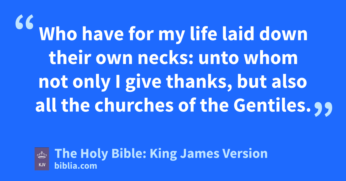 1 † I commend unto you Phebe our sister, which is a servant of the church which is at Cenchrea: 2 That ye receive her in the Lord, as becometh saints, and that ye assist her in whatsoever business she hath need of you: for she hath been a succourer of many, and of myself also. 3 Greet Priscilla and Aquila my helpers in Christ Jesus: 4 Who have for my life laid down their own necks: unto whom not only I give thanks, but also all the churches of the Gentiles. 5 Likewise greet the church that is in their house. Salute my wellbeloved Epaenetus, who is the firstfruits of Achaia unto Christ. 6 Greet Mary, who bestowed much labour on us. 7 Salute Andronicus and Junia, my kinsmen, and my fellowprisoners, who are of note among the apostles, who also were in Christ before me. 8 Greet Amplias my beloved in the Lord. 9 Salute Urbane, our helper in Christ, and Stachys my beloved. 10 Salute Apelles approved in Christ. Salute them which are of Aristobulus’ household. 11 Salute Herodion my kinsman. Greet them that be of the household of Narcissus, which are in the Lord. 12 Salute Tryphena and Tryphosa, who labour in the Lord. Salute the beloved Persis, which laboured much in the Lord. 13 Salute Rufus chosen in the Lord, and his mother and mine. 14 Salute Asyncritus, Phlegon, Hermas, Patrobas, Hermes, and the brethren which are with them. 15 Salute Philologus, and Julia, Nereus, and his sister, and Olympas, and all the saints which are with them. 16 Salute one another with an holy kiss. The churches of Christ salute you.