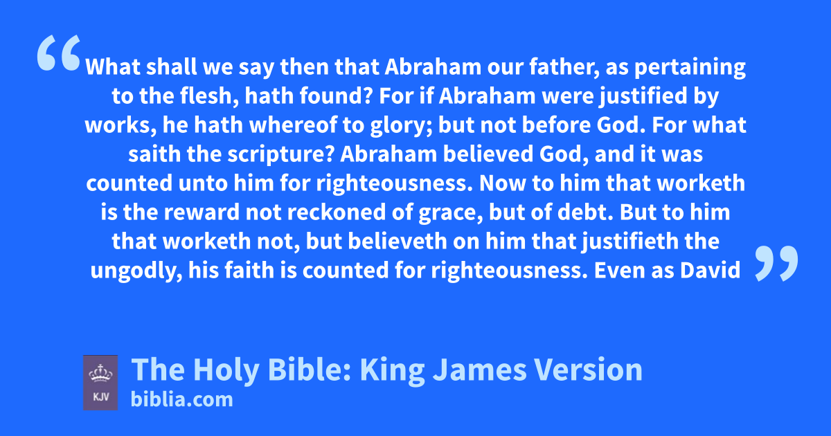 1 What shall we say then that Abraham our father, as pertaining to the flesh, hath found? 2 For if Abraham were justified by works, he hath whereof to glory; but not before God. 3 For what saith the scripture? Abraham believed God, and it was counted unto him for righteousness. 4 Now to him that worketh is the reward not reckoned of grace, but of debt. 5 But to him that worketh not, but believeth on him that justifieth the ungodly, his faith is counted for righteousness. 6 Even as David also describeth the blessedness of the man, unto whom God imputeth righteousness without works, 7 Saying, Blessed are they whose iniquities are forgiven, and whose sins are covered. 8 Blessed is the man to whom the Lord will not impute sin.