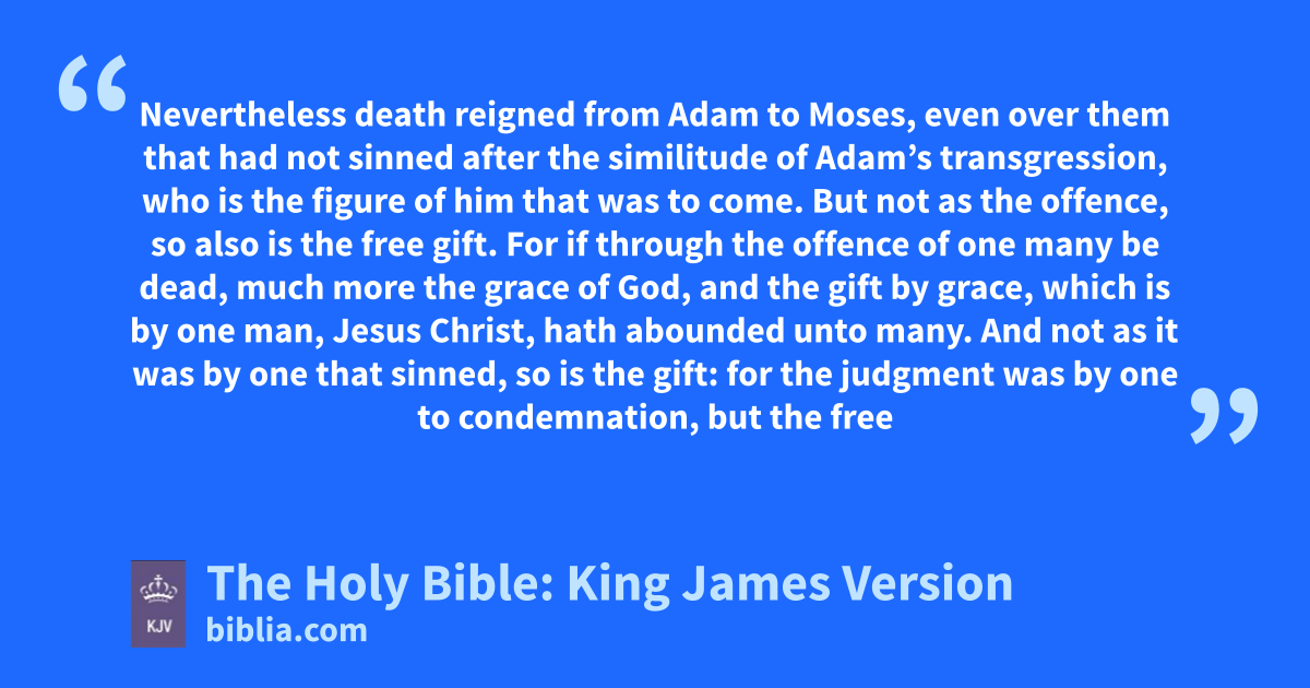 6 For when we were yet without strength, in due timea Christ died for the ungodly. 7 For scarcely for a righteous man will one die: yet peradventure for a good man some would even dare to die. 8 But God commendeth his love toward us, in that, while we were yet sinners, Christ died for us. 9 Much more then, being now justified by his blood, we shall be saved from wrath through him. 10 For if, when we were enemies, we were reconciled to God by the death of his Son, much more, being reconciled, we shall be saved by his life. 11 And not only so, but we also joy in God through our Lord Jesus Christ, by whom we have now received the atonementb. 12 Wherefore, as by one man sin entered into the world, and death by sin; and so death passed upon all men, for thatc all have sinned: 13 (For until the law sin was in the world: but sin is not imputed when there is no law. 14 Nevertheless death reigned from Adam to Moses, even over them that had not sinned after the similitude of Adam’s transgression, who is the figure of him that was to come. 15 But not as the offence, so also is the free gift. For if through the offence of one many be dead, much more the grace of God, and the gift by grace, which is† by one man, Jesus Christ, hath abounded unto many. 16 And not as it was by one that sinned, so is the gift: for the judgment was by one to condemnation, but the free gift is of many offences unto justification. 17 For if by one man’sd offence death reigned by one; much more they which receive abundance of grace and of the gift of righteousness shall reign in life by one, Jesus Christ.) 18 Therefore as by the offencee of one judgment came upon all men to condemnation; even so by the righteousness of one the free gift came upon all men unto justification of life. 19 For as by one man’s disobedience many were made sinners, so by the obedience of one shall many be made righteous. 20 Moreover the law entered, that the offence might abound. But where sin abounded, grace did much more abound: 21 That as sin hath reigned unto death, even so might grace reign through righteousness unto eternal life by Jesus Christ our Lord.