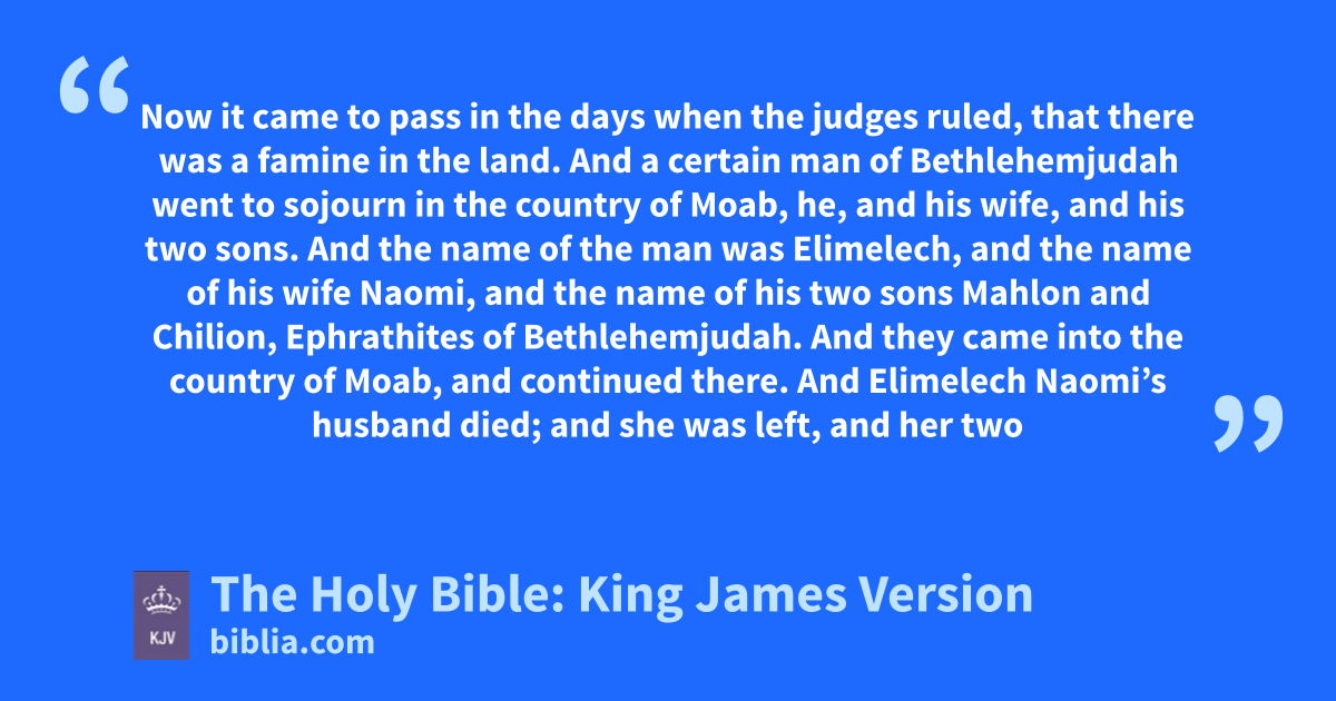 1 Now it came to pass in the days when the judges ruleda, that there was a famine in the land. And a certain man of Bethlehemjudah went to sojourn in the country of Moab, he, and his wife, and his two sons. 2 And the name of the man was Elimelech, and the name of his wife Naomi, and the name of his two sons Mahlon and Chilion, Ephrathites of Bethlehemjudah. And they came into the country of Moab, and continued there. 3 And Elimelech Naomi’s husband died; and she was left, and her two sons. 4 And they took them wives of the women of Moab; the name of the one was Orpah, and the name of the other Ruth: and they dwelled there about ten years. 5 And Mahlon and Chilion died also both of them; and the woman was left of her two sons and her husband.