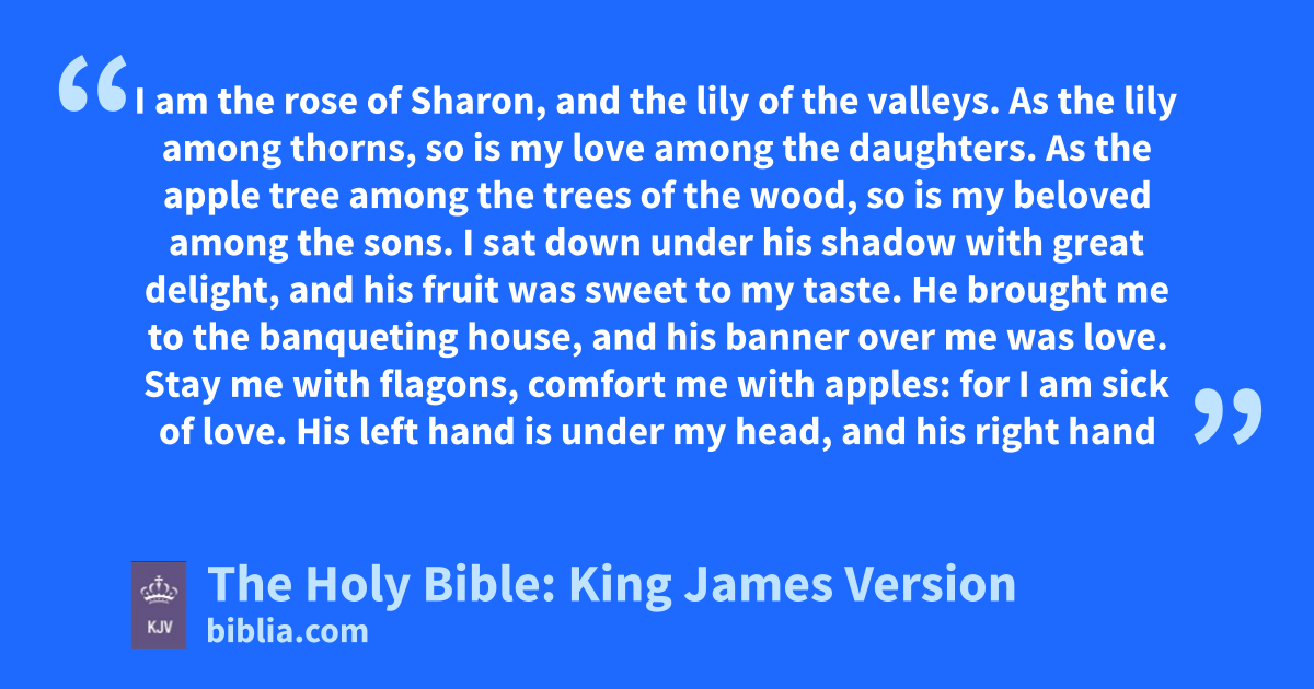 3 As the apple tree among the trees of the wood, so is my beloved among the sons. I sata down under his shadow with great delight, and his fruit was sweet to my taste. 4 He brought me to the banquetingb house, and his banner over me was love. 5 Stay me with flagons, comfortc me with apples: for I am sick of love. 6 His left hand is under my head, and his right hand doth embrace me. 7 I charged you, O ye daughters of Jerusalem, by the roes, and by the hinds of the field, that ye stir not up, nor awake my love, till he please.