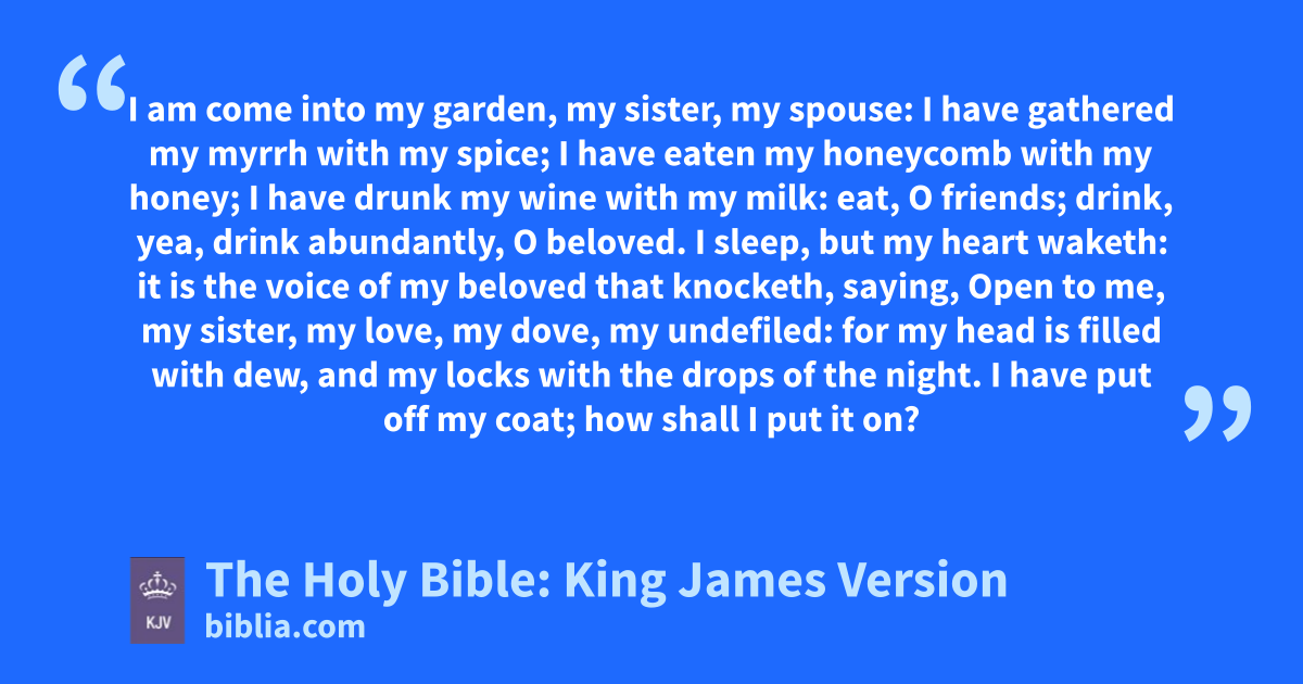 1 I am come into my garden, my sister, my spouse: I have gathered my myrrh with my spice; I have eaten my honeycomb with my honey; I have drunk my wine with my milk: eat, O friends; drink, yea, drink abundantlya, O beloved.