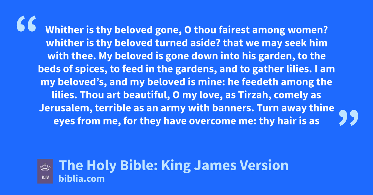 1 Whither is thy beloved gone, O thou fairest among women? whither is thy beloved turned aside? that we may seek him with thee. 2 My beloved is gone down into his garden, to the beds of spices, to feed in the gardens, and to gather lilies. 3 I am my beloved’s, and my beloved is mine: he feedeth among the lilies.