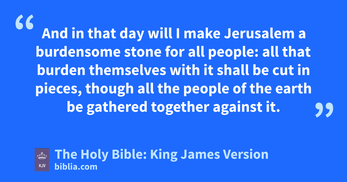 1 The burden of the word of the LORD for Israel, saith the LORD, which stretcheth forth the heavens, and layeth the foundation of the earth, and formeth the spirit of man within him. 2 Behold, I will make Jerusalem a cup of tremblinga unto all the people round about, when they shall be in the siege both against Judah and against Jerusalem. 3 And in that day will I make Jerusalem a burdensome stone for all people: all that burden themselves with it shall be cut in pieces, though all the people of the earth be gathered together against it. 4 In that day, saith the LORD, I will smite every horse with astonishment, and his rider with madness: and I will open mine eyes upon the house of Judah, and will smite every horse of the people with blindness. 5 And the governors of Judah shall say in their heart, The inhabitantsb of Jerusalem shall be my strength in the LORD of hosts their God. 6 In that day will I make the governors of Judah like an hearth of fire among the wood, and like a torch of fire in a sheaf; and they shall devour all the people round about, on the right hand and on the left: and Jerusalem shall be inhabited again in her own place, even in Jerusalem. 7 The LORD also shall save the tents of Judah first, that the glory of the house of David and the glory of the inhabitants of Jerusalem do not magnify themselves against Judah. 8 In that day shall the LORD defend the inhabitants of Jerusalem; and he that is feeblec among them at that day shall be as David; and the house of David shall be as God, as the angel of the LORD before them.
