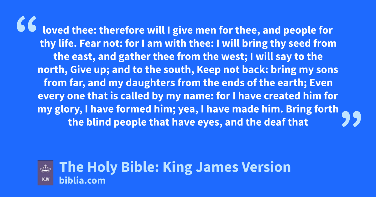 1 But now thus saith the LORD that created thee, O Jacob, and he that formed thee, O Israel, Fear not: for I have redeemed thee, I have called thee by thy name; thou art mine. 2 When thou passest through the waters, I will be with thee; and through the rivers, they shall not overflow thee: when thou walkest through the fire, thou shalt not be burned; neither shall the flame kindle upon thee. 3 For I am the LORD thy God, the Holy One of Israel, thy Saviour: I gave Egypt for thy ransom, Ethiopia and Seba for thee. 4 Since thou wast precious in my sight, thou hast been honourable, and I have loved thee: therefore will I give men for thee, and people for thy lifea. 5 Fear not: for I am with thee: I will bring thy seed from the east, and gather thee from the west; 6 I will say to the north, Give up; and to the south, Keep not back: bring my sons from far, and my daughters from the ends of the earth; 7 Even every one that is called by my name: for I have created him for my glory, I have formed him; yea, I have made him.