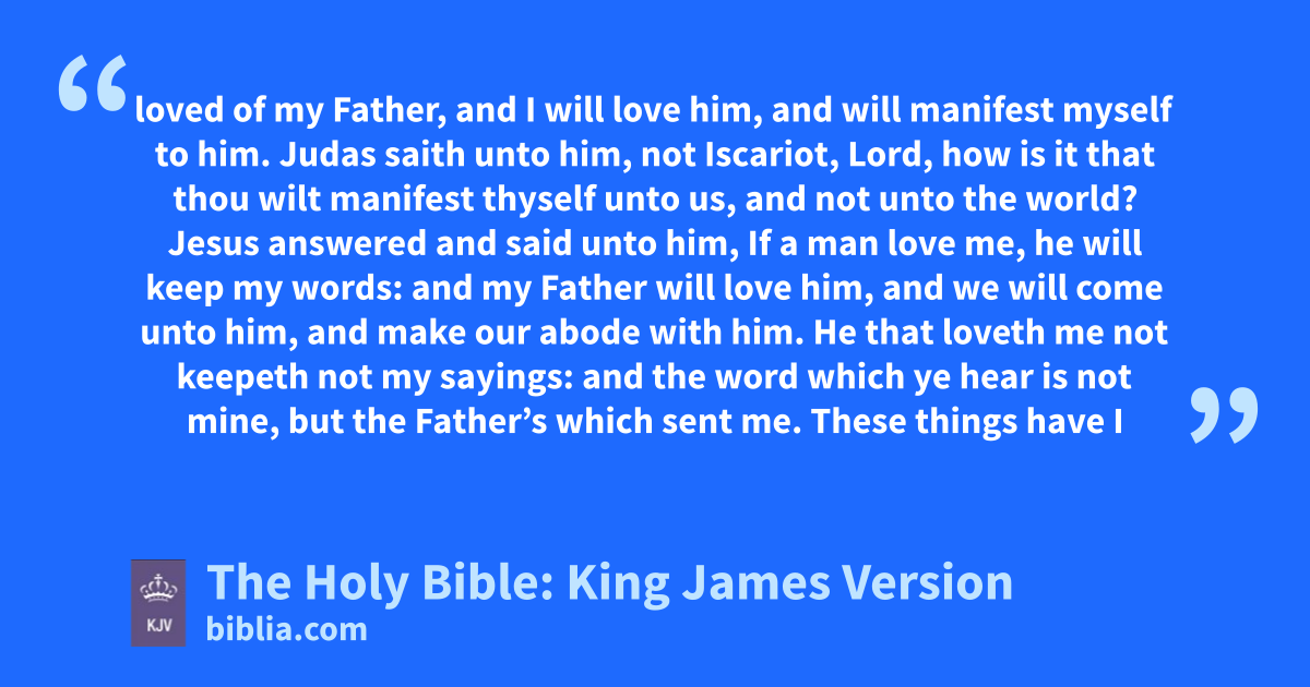 18 I will not leave you comfortlessa: I will come to you. 19 Yet a little while, and the world seeth me no more; but ye see me: because I live, ye shall live also. 20 At that day ye shall know that I am in my Father, and ye in me, and I in you. 21 He that hath my commandments, and keepeth them, he it is that loveth me: and he that loveth me shall be loved of my Father, and I will love him, and will manifest myself to him. 22 Judas saith unto him, not Iscariot, Lord, how is it that thou wilt manifest thyself unto us, and not unto the world? 23 Jesus answered and said unto him, If a man love me, he will keep my words: and my Father will love him, and we will come unto him, and make our abode with him. 24 He that loveth me not keepeth not my sayings: and the word which ye hear is not mine, but the Father’s which sent me.