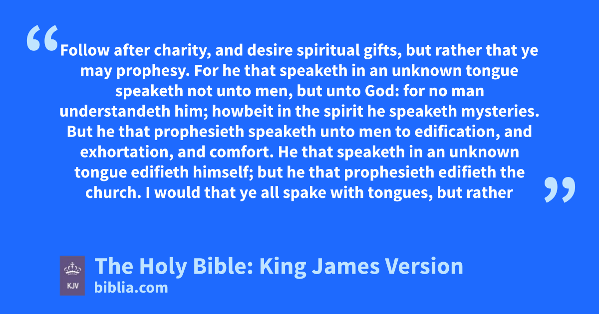 1 Follow after charity, and desire spiritual gifts, but rather that ye may prophesy. 2 For he that speaketh in an unknown tongue speaketh not unto men, but unto God: for no man understandetha him; howbeit in the spirit he speaketh mysteries. 3 But he that prophesieth speaketh unto men to edification, and exhortation, and comfort. 4 He that speaketh in an unknown tongue edifieth himself; but he that prophesieth edifieth the church. 5 † I would that ye all spake with tongues, but rather that ye prophesied: for greater is he that prophesieth than he that speaketh with tongues, except he interpret, that the church may receive edifying.