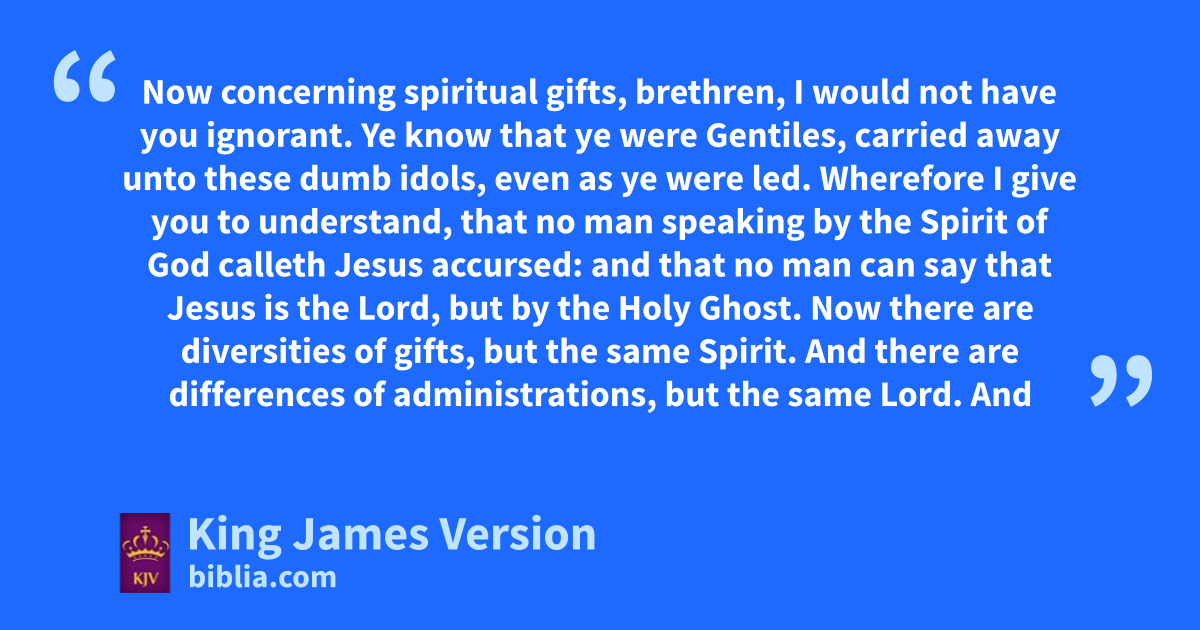 12 Now aconcerning spiritual gifts, brethren, bI would not have you ignorant. 2 Ye know that cye were Gentiles, dcarried away unto these edumb idols, even as ye were led. 3 Wherefore I give you to understand, that fno man speaking by the Spirit of God calleth Jesus ||accursed: and that gno man can say that Jesus is the Lord, but by the Holy Ghost. 4 Now hthere are diversities of gifts, but ithe same Spirit. 5 And kthere are ldifferences of ||administrations, but ithe same Lord. 6 And there are diversities of moperations, but it is ithe same God which worketh all in nall. 7 oBut the manifestation of the Spirit is given to every man to profit withal. 8 For to one is given by the Spirit the word of pwisdom; to another the word of qknowledge by the same Spirit; 9 To another rfaith sby the same Spirit; to another tthe gifts of healing by the same Spirit; 10 To another the mworking of umiracles; to another xprophecy; to another ydiscerning of spirits; to another zdivers kinds of tongues; to another athe interpretation of tongues: 11 But all these worketh that one and the selfsame Spirit, aadividing to every man severally bas he will.