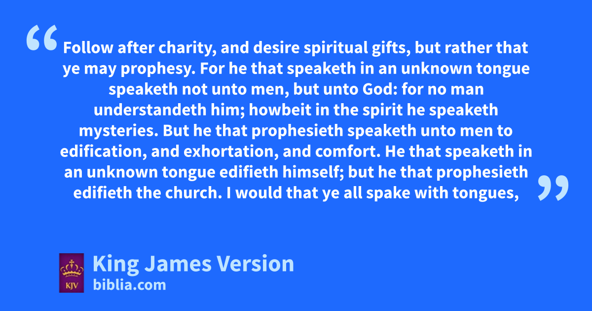 14 aFollow after charity, and aadesire bspiritual gifts, but rather that ye may cprophesy. 2 For he that dspeaketh in an unknown tongue speaketh not unto men, but unto God: for no man †eunderstandeth him; howbeit in the spirit he speaketh mysteries. 3 But he that cprophesieth speaketh unto men to fedification, and gexhortation, and hcomfort. 4 He that speaketh in an unknown tongue edifieth himself; but he that cprophesieth iedifieth the church. 5 I would that ye all dspake with tongues, but jrather that ye cprophesied: for greater is he that prophesieth than he that speaketh with tongues, kexcept he interpret, that the church may receive edifying. 6 Now, brethren, if I come unto you speaking with tongues, what shall I profit you, except I shall speak to you either by lrevelation, or by mknowledge, or by cprophesying, or by ndoctrine? 7 And even things without life giving sound, whether pipe or harp, except they give a distinction in the ||osounds, how shall it be known what is piped or harped? 8 For if pthe trumpet give an uncertain sound, who shall prepare himself to qthe battle? 9 So likewise ye, except ye utter by the tongue words †easy to be understood, how shall it be known what is spoken? for ye shall rspeak into the air. 10 There are, sit may be, tso many ukinds of voices in the world, and none of them is without signification. 11 Therefore if I know not the meaning of the voice, I shall be unto him that speaketh a xbarbarian, and he that speaketh shall be a barbarian unto me. 12 Even so ye, forasmuch as ye are zealous †of spiritual gifts, seek that ye may excel to fthe edifying of the church. 13 Wherefore let him that dspeaketh in an unknown tongue pray kthat he may interpret. 14 For if I pray in an unknown tongue, my spirit prayeth, but my understanding is unfruitful. 15 What is it then? I will pray with the spirit, and I will pray with the understanding also: yI will sing with the spirit, and I will sing zwith the understanding also. 16 Else when thou shalt abless with the spirit, how shall he that occupieth the room of the bunlearned say cAmen at dthy giving of thanks, seeing he understandeth not what thou sayest? 17 For thou verily givest dthanks well, but the other is not edified. 18 I thank my God, I cspeak with tongues more than ye all: 19 Yet in the church I had rather speak five words with my understanding, that by my voice I might eteach others also, than ten thousand words in an unknown tongue. 20 Brethren, fbe not children in understanding: howbeit in malice gbe ye children, but in understanding be †men. 21 hIn the law it is written, iWith men of other tongues and other lips will I speak unto this people; and yet for all that will they not hear me, saith the Lord. 22 Wherefore tongues are for a sign, not to them that believe, but to them that believe not: but kprophesying serveth not for them that believe not, but for them which believe. 23 If therefore the whole church be come together into one place, and all speak with tongues, and there come in those that are bunlearned, or unbelievers, lwill they not say that ye are mad? 24 But if all kprophesy, and there come in one that believeth not, or one bunlearned, he is mconvinced of all, he is njudged of all: 25 And thus are the secrets of his heart made manifest; and so ofalling down on his face phe will worship God, and qreport that God is in you of a truth.