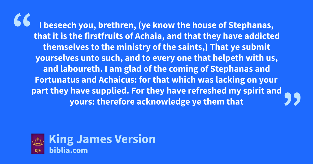 15 I beseech you, brethren, (ye know the house of iStephanas, that it is kthe firstfruits of lAchaia, and that they have addicted themselves to mnthe ministry of the saints,) 16 oThat ye submit yourselves unto such, and to every one that helpeth with us, and nlaboureth. 17 I am glad of the coming of iStephanas and Fortunatus and Achaicus: pfor that which was lacking on your part they have supplied. 18 For they have qrefreshed my spirit and yours: therefore oacknowledge ye them that are such. 19 The churches of rAsia salute you. sAquila and Priscilla salute you much in the Lord, twith the church that is in their house. 20 All the brethren greet you. uGreet ye one another with an holy kiss.