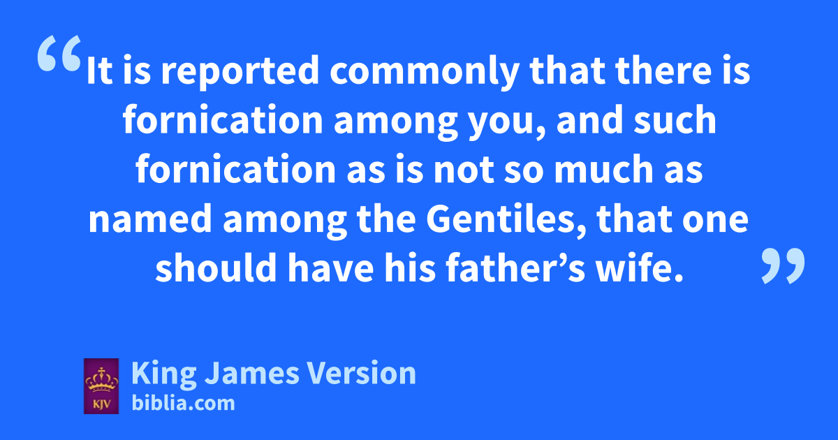 5 It is reported acommonly that there is aafornication among you, and such fornication as is not so much as bnamed among the Gentiles, cthat one should have his dfather’s wife. 2 And ye are epuffed up, and have not rather fmourned, that he that hath done this deed might be taken away from among you. 3 For I verily, as gabsent in body, but present in spirit, have ||judged already, as though I were present, concerning him that hath so done this deed, 4 In the name of our Lord Jesus Christ, when ye are gathered together, gand my spirit, hwith the power of our Lord Jesus Christ, 5 iTo deliver such an one unto kSatan for the destruction of the flesh, lthat the spirit may be saved in mthe day of the Lord Jesus. 6 nYour glorying is not good. Know ye not that oa little leaven leaveneth the whole lump? 7 Purge out therefore the old leaven, that ye may be a new lump, as ye are unleavened. For even pChrist our passover ||is sacrificed for us: 8 Therefore qlet us keep ||the feast, qnot with old leaven, neither with othe leaven of rmalice and wickedness; but with the unleavened bread of ssincerity and truth.