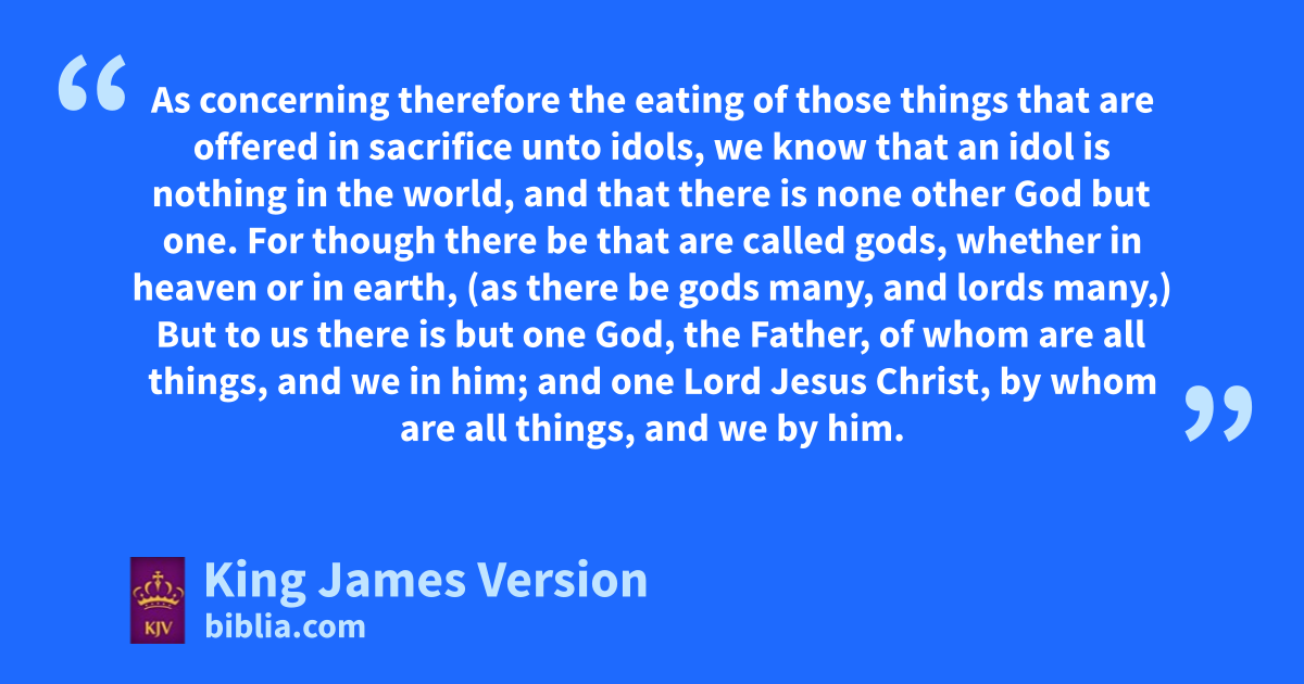 8 Now as touching athings offered unto idols, we know that we all have bknowledge. bcKnowledge dpuffeth up, but charity eedifieth. 2 And fif any man think that he knoweth any thing, he knoweth nothing yet as he ought to know. 3 But if any man love God, gthe same is known of him. 4 As concerning therefore the eating of athose things that are offered in sacrifice unto idols, we know that han idol is nothing in the world, and that ithere is none other God but one. 5 For kthough there be that are called gods, whether in heaven or in earth, (as there be gods many, and lords many,) 6 But ito us there is but one God, lthe Father, mof whom are all things, and we ||in him; and none Lord Jesus Christ, oby whom are all things, and we by him. 7 Howbeit there is not in every man that bknowledge: for some pwith conscience of the idol unto this hour eat it as aa thing offered unto an idol; and their conscience being weak qis defiled. 8 But rmeat commendeth us not to God: for neither, if we eat, ||are we the better; neither, if we eat not, ||are we the worse. 9 But stake heed tlest by any means this ||liberty of yours become a ustumblingblock vto them that are weak. 10 For wif any man see thee which hast bknowledge sit at meat in xthe idol’s temple, shall not pthe conscience of him which is weak be †emboldened to eat athose things which are offered to idols; 11 wAnd through thy knowledge shall vthe weak brother perish, yfor whom Christ died? 12 But zwhen ye sin so against the brethren, and wound their weak conscience, ye sin against Christ. 13 Wherefore, aif meat bmake my brother to offend, cI will eat no flesh while the world standeth, lest I bmake my brother to offend.