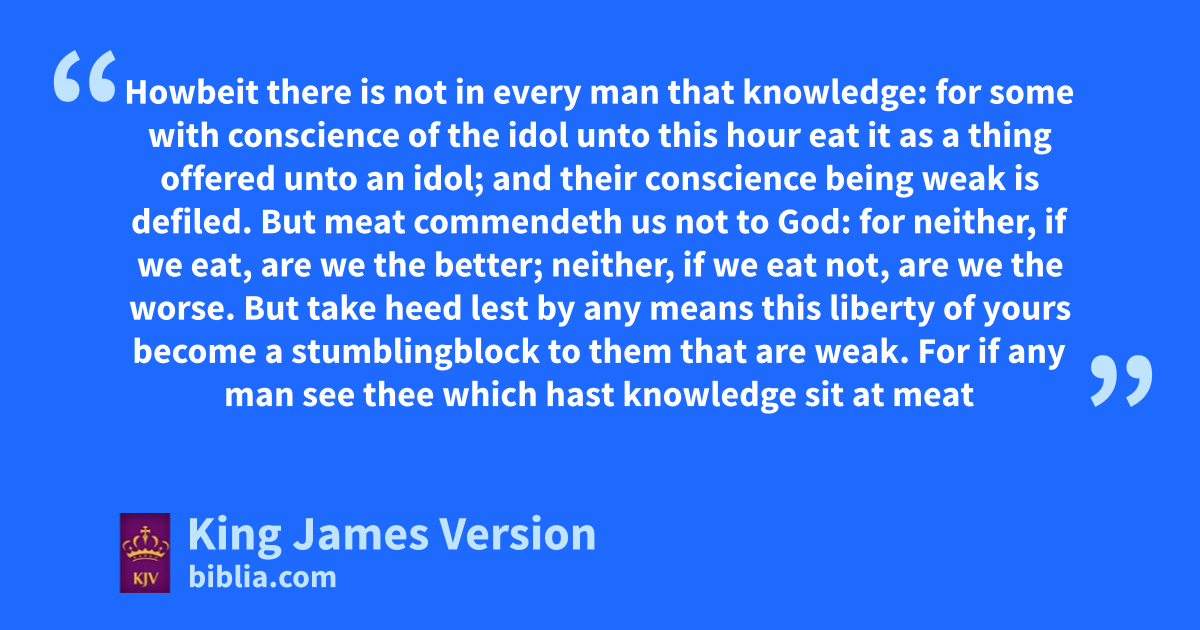 8 Now as touching athings offered unto idols, we know that we all have bknowledge. bcKnowledge dpuffeth up, but charity eedifieth. 2 And fif any man think that he knoweth any thing, he knoweth nothing yet as he ought to know. 3 But if any man love God, gthe same is known of him. 4 As concerning therefore the eating of athose things that are offered in sacrifice unto idols, we know that han idol is nothing in the world, and that ithere is none other God but one. 5 For kthough there be that are called gods, whether in heaven or in earth, (as there be gods many, and lords many,) 6 But ito us there is but one God, lthe Father, mof whom are all things, and we ||in him; and none Lord Jesus Christ, oby whom are all things, and we by him. 7 Howbeit there is not in every man that bknowledge: for some pwith conscience of the idol unto this hour eat it as aa thing offered unto an idol; and their conscience being weak qis defiled. 8 But rmeat commendeth us not to God: for neither, if we eat, ||are we the better; neither, if we eat not, ||are we the worse. 9 But stake heed tlest by any means this ||liberty of yours become a ustumblingblock vto them that are weak. 10 For wif any man see thee which hast bknowledge sit at meat in xthe idol’s temple, shall not pthe conscience of him which is weak be †emboldened to eat athose things which are offered to idols; 11 wAnd through thy knowledge shall vthe weak brother perish, yfor whom Christ died? 12 But zwhen ye sin so against the brethren, and wound their weak conscience, ye sin against Christ. 13 Wherefore, aif meat bmake my brother to offend, cI will eat no flesh while the world standeth, lest I bmake my brother to offend.