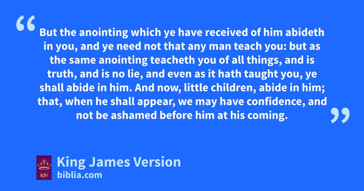 12 I write unto you, little children, because zyour sins are forgiven you for his name’s sake. 13 I write unto you, fathers, because ye have known ahim that is from the beginning. I write unto you, young men, because ye have overcome bthe wicked one. I write unto you, clittle children, because ye have known the Father. 14 I have written unto you, fathers, because ye have known ahim that is from the beginning. I have written unto you, young men, because dye are strong, and the word of God abideth in you, and ye have overcome bthe wicked one. 15 eLove not the world, neither the things that are in the world. fIf any man love the world, the love of the Father is not in him. 16 For all that is in the world, gthe lust of the flesh, and hthe lust of the eyes, and ithe pride of life, is not of the Father, but is of the world. 17 And kthe world passeth away, and the lust thereof: but he that doeth lthe will of God abideth for ever. 18 cLittle children, mit is the last time: and as ye have heard that nantichrist shall come, even now are there omany antichrists; whereby we know mthat it is the last time. 19 pThey went out from us, but they were not of us; for if they had been of us, qthey would no doubt have continued with us: but they went out, rthat they might be made manifest that they were not sall of us. 20 But ye have tan unction from uthe Holy One, and vye know all things. 21 I have not written unto you because ye know not the truth, but because xye know it, and that no lie is of the truth. 22 Who is a liar but yhe that denieth that Jesus is the Christ? He is nantichrist, that zdenieth the Father and the Son. 23 aWhosoever zdenieth the Son, the same bhath not the Father: (but) che that acknowledgeth the Son bhath the Father also. 24 Let that therefore abide in you, dwhich ye have heard from the beginning. If that dwhich ye have heard from the beginning shall remain in you, eye also shall continue in the Son, and in the Father. 25 And this is the promise that he hath promised us, even feternal life. 26 These things have I written unto you concerning gthem that seduce you. 27 But hthe anointing which ye have received of him abideth in you, and iye need not that any man teach you: but as the same anointing hjteacheth you of all things, and kis truth, and is no lie, and even as it hath taught you, lye shall abide in ||him. 28 And now, little children, abide in him; that, mwhen he shall appear, nwe may have confidence, and onot be ashamed pbefore him qat his coming. 29 If ye know that rhe is righteous, ||ye know that severy one that doeth righteousness is born of him.