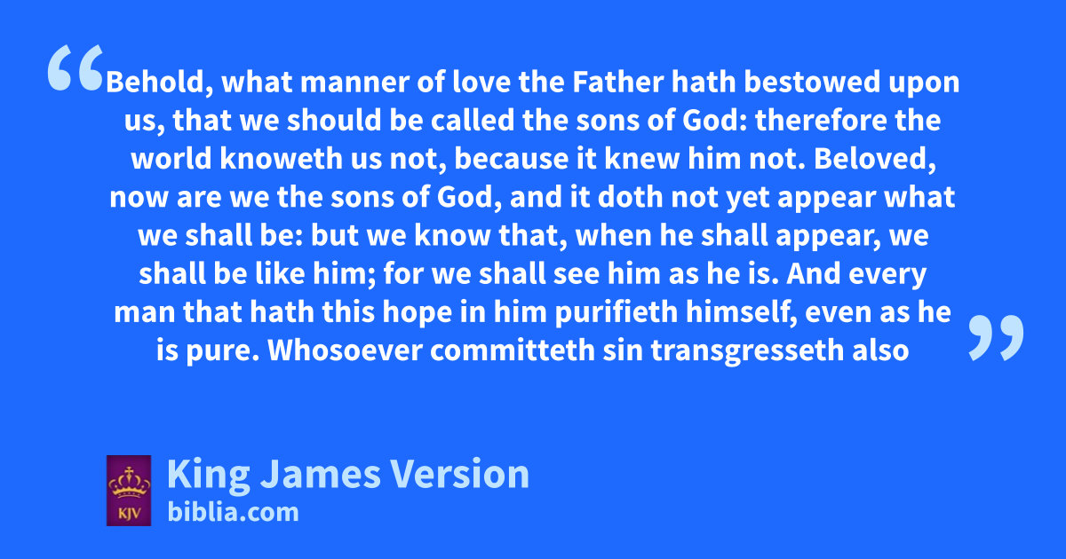 3 Behold, awhat manner of love the Father hath bestowed upon us, that bwe should be called cthe sons of God: therefore the world knoweth us not, because dit knew him not. 2 Beloved, enow are we cthe sons of God, and fit doth not yet appear what we shall be: but gwe know that, hwhen he shall appear, iwe shall be like him; for kwe shall lsee him as he is. 3 And every man mthat hath this hope in him npurifieth himself, oeven as he is pure. 4 Whosoever committeth sin transgresseth also the law: for psin is the transgression of the law. 5 And ye know that qrhe was manifested rsto take away our sins; and tin him is no sin. 6 Whosoever abideth in him sinneth not: whosoever sinneth uhath not seen him, vneither known him. 7 Little children, wlet no man deceive you: xhe that doeth righteousness is righteous, oeven as he is righteous. 8 yHe that committeth sin is of the devil; for zthe devil sinneth from the beginning. For this purpose the Son of God was manifested, athat he might bdestroy the works of the devil. 9 cWhosoever is born of God doth not commit sin; for dhis seed remaineth in him: and he cannot sin, because ehe is born of God. 10 In this fthe children of God are manifest, and gthe children of the devil: hwhosoever doeth not righteousness is not of God, neither ihe that loveth not his brother. 11 For kthis is the ||message lthat ye heard from the beginning, mthat we should love one another. 12 Not as nCain, who was of othat wicked one, and slew his brother. And wherefore slew he him? pBecause his own works were evil, and his brother’s righteous. 13 Marvel not, my brethren, if qthe world hate you. 14 rWe know that swe have passed from death unto life, because we love the brethren. He that loveth not his brother abideth in death. 15 tWhosoever hateth his brother is ua murderer: and ye know that vno murderer hath eternal life abiding in him. 16 wxHereby perceive we the love of God, because xhe laid down his life for us: and ywe ought to lay down our lives for the brethren. 17 But zwhoso hath this world’s agood, and seeth his brother have need, and bshutteth up chis bowels of compassion from him, dhow dwelleth the love of God in him? 18 My little children, elet us not love in word, neither in tongue; but in deed and eein truth. 19 And hereby we know that we are fof the truth, and gshall †assure our hearts before him. 20 For hif our heart condemn us, God is greater than our heart, and knoweth all things. 21 Beloved, iif our heart condemn us not, then jhave we confidence ktoward God. 22 And lwhatsoever we ask, we receive of him, because we mkeep his commandments, and do nthose things that are pleasing in his sight. 23 And this is his commandment, oThat we should believe on the name of his Son Jesus Christ, and plove one another, qas he gave us commandment. 24 And he that mkeepeth his commandments rdwelleth in him, and rshe in him. And thereby we know that he abideth in us, by the Spirit which he hath given us.