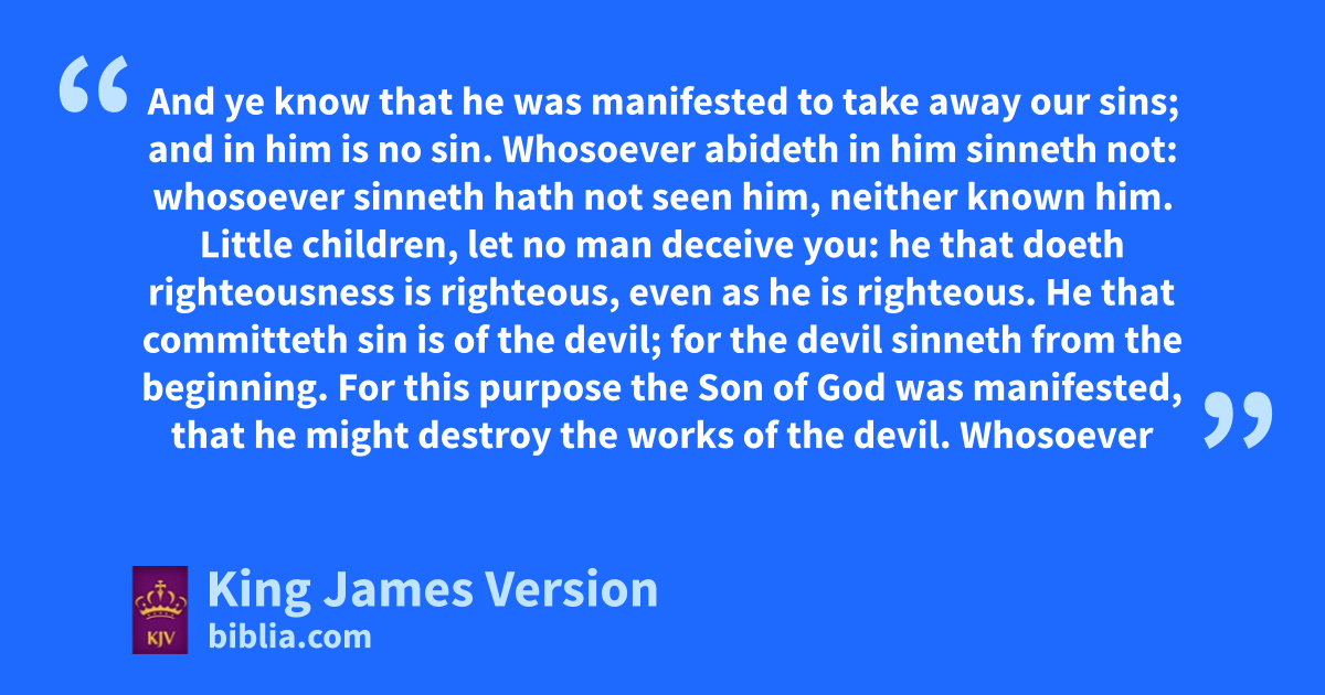 3 Behold, awhat manner of love the Father hath bestowed upon us, that bwe should be called cthe sons of God: therefore the world knoweth us not, because dit knew him not. 2 Beloved, enow are we cthe sons of God, and fit doth not yet appear what we shall be: but gwe know that, hwhen he shall appear, iwe shall be like him; for kwe shall lsee him as he is. 3 And every man mthat hath this hope in him npurifieth himself, oeven as he is pure. 4 Whosoever committeth sin transgresseth also the law: for psin is the transgression of the law. 5 And ye know that qrhe was manifested rsto take away our sins; and tin him is no sin. 6 Whosoever abideth in him sinneth not: whosoever sinneth uhath not seen him, vneither known him. 7 Little children, wlet no man deceive you: xhe that doeth righteousness is righteous, oeven as he is righteous. 8 yHe that committeth sin is of the devil; for zthe devil sinneth from the beginning. For this purpose the Son of God was manifested, athat he might bdestroy the works of the devil. 9 cWhosoever is born of God doth not commit sin; for dhis seed remaineth in him: and he cannot sin, because ehe is born of God. 10 In this fthe children of God are manifest, and gthe children of the devil: hwhosoever doeth not righteousness is not of God, neither ihe that loveth not his brother. 11 For kthis is the ||message lthat ye heard from the beginning, mthat we should love one another. 12 Not as nCain, who was of othat wicked one, and slew his brother. And wherefore slew he him? pBecause his own works were evil, and his brother’s righteous. 13 Marvel not, my brethren, if qthe world hate you. 14 rWe know that swe have passed from death unto life, because we love the brethren. He that loveth not his brother abideth in death. 15 tWhosoever hateth his brother is ua murderer: and ye know that vno murderer hath eternal life abiding in him. 16 wxHereby perceive we the love of God, because xhe laid down his life for us: and ywe ought to lay down our lives for the brethren. 17 But zwhoso hath this world’s agood, and seeth his brother have need, and bshutteth up chis bowels of compassion from him, dhow dwelleth the love of God in him? 18 My little children, elet us not love in word, neither in tongue; but in deed and eein truth. 19 And hereby we know that we are fof the truth, and gshall †assure our hearts before him. 20 For hif our heart condemn us, God is greater than our heart, and knoweth all things. 21 Beloved, iif our heart condemn us not, then jhave we confidence ktoward God. 22 And lwhatsoever we ask, we receive of him, because we mkeep his commandments, and do nthose things that are pleasing in his sight. 23 And this is his commandment, oThat we should believe on the name of his Son Jesus Christ, and plove one another, qas he gave us commandment. 24 And he that mkeepeth his commandments rdwelleth in him, and rshe in him. And thereby we know that he abideth in us, by the Spirit which he hath given us.