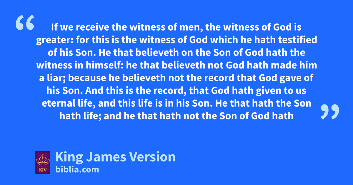 5 Whosoever abelieveth that bJesus is the Christ is cborn of God: and devery one that loveth him that begat loveth him also that is begotten of him. 2 By this we know that we love ethe children of God, when we love God, and fkeep his commandments. 3 For gthis is the love of God, that we fkeep his commandments: and hhis commandments are not grievous. 4 For whatsoever is born of God iovercometh the world: and jthis is the victory that overcometh the world, even our faith. 5 Who is he that iovercometh the world, but jhe that believeth kthat Jesus is the Son of God? 6 This is he that came lby water and lblood, even Jesus Christ; not mby water only, but by water and blood. And nit is the Spirit that beareth witness, because the Spirit is truth. 7 For there are three that bear record in heaven, the Father, the Word, and the Holy Ghost: and these three are one. 8 And there are three that bear witness in earth, othe spirit, and lthe water, and lthe blood: and these three agree in one. 9 pIf we receive the witness of men, qthe witness of God is greater: for this is the witness of God rwhich he hath testified of his Son. 10 He that believeth on the Son of God shath the witness in himself: he that believeth not God thath made him a liar; because he believeth not the record that God gave of his Son. 11 And this is the record, that God hath given to us ueternal life, and vthis life is in his Son. 12 wHe that xhath the Son hath life; and he that hath not the Son of God hath not life.