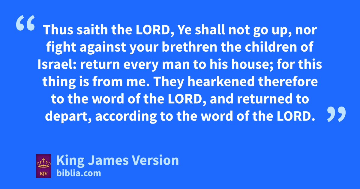 21 And when Rehoboam was come to Jerusalem, he assembled all the house of Judah, with the tribe of Benjamin, an hundred and fourscore thousand chosen men, which were warriors, to fight against the house of Israel, to bring the kingdom again to Rehoboam the son of Solomon. 22 But the word of God came unto sShemaiah tthe man of God, saying, 23 Speak unto Rehoboam, the son of Solomon, king of Judah, and unto all the house of Judah and Benjamin, and to the remnant of the people, saying, 24 Thus saith the Lord, Ye shall not go up, nor fight against your brethren the children of Israel: return every man to his house; ufor this thing is from me. They hearkened therefore to the word of the Lord, and returned to depart, according to the word of the Lord.