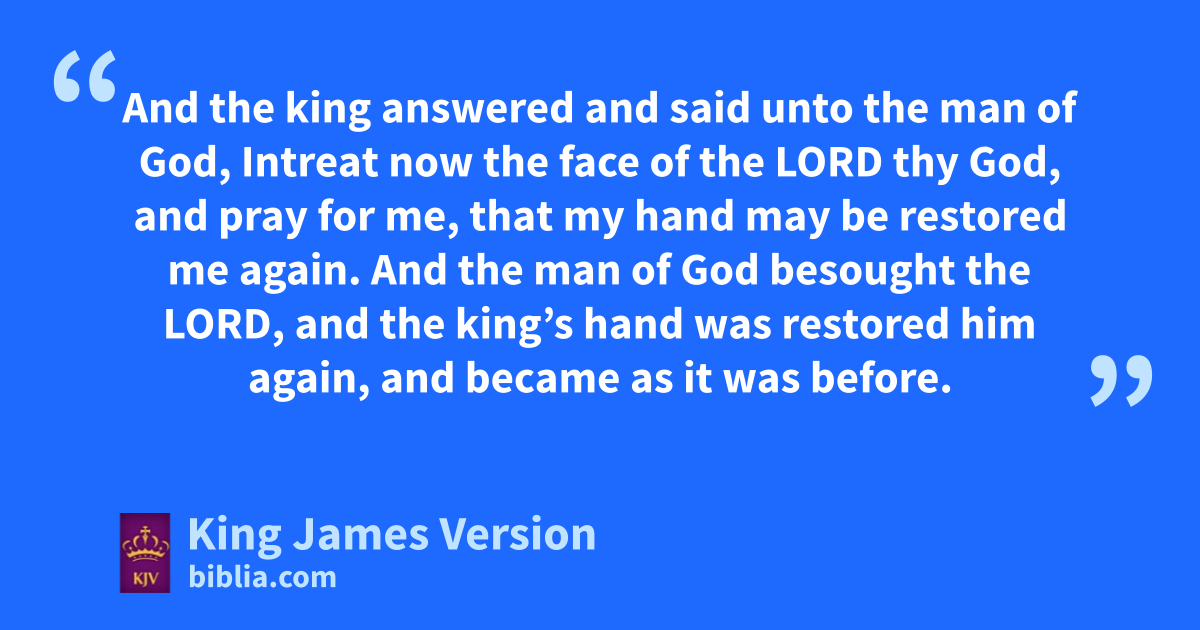 13 And, behold, there acame ba man of God out of Judah by the word of the Lord unto Beth-el: and Jeroboam stood by the altar ||to burn incense. 2 And he cried against the altar in the word of the Lord, and said, O altar, altar, thus saith the Lord; Behold, a child shall be born unto the house of David, cJosiah by name; and upon thee shall he offer the priests of the high places that burn incense upon thee, and men’s bones shall be burnt upon thee. 3 And he gave da sign the same day, saying, This is the sign which the Lord hath spoken; Behold, the altar shall be rent, and the ashes that are upon it shall be poured out. 4 And it came to pass, when king Jeroboam heard the saying of the man of God, which had cried against the altar in Beth-el, that he put forth his hand from the altar, saying, Lay hold on him. And his hand, which he put forth against him, dried up, so that he could not pull it in again to him. 5 The altar also was rent, and the ashes poured out from the altar, according to the sign which the man of God had given by the word of the Lord. 6 And the king answered and said unto the man of God, eIntreat now the face of the Lord thy God, and fpray for me, that my hand may be restored me again. And the man of God besought †the Lord, and the king’s hand was restored him again, and became as it was before. 7 And the king said unto the man of God, Come home with me, and grefresh thyself, and hI will give thee a reward. 8 And the man of God said unto the king, iIf thou wilt give me half thine house, I will not go in with thee, neither will I eat bread nor drink water in this place: 9 For so was it charged me by the word of the Lord, saying, Eat no bread, nor drink water, nor turn again by the same way that thou camest. 10 So he went another way, and returned not by the way that he came to Beth-el.