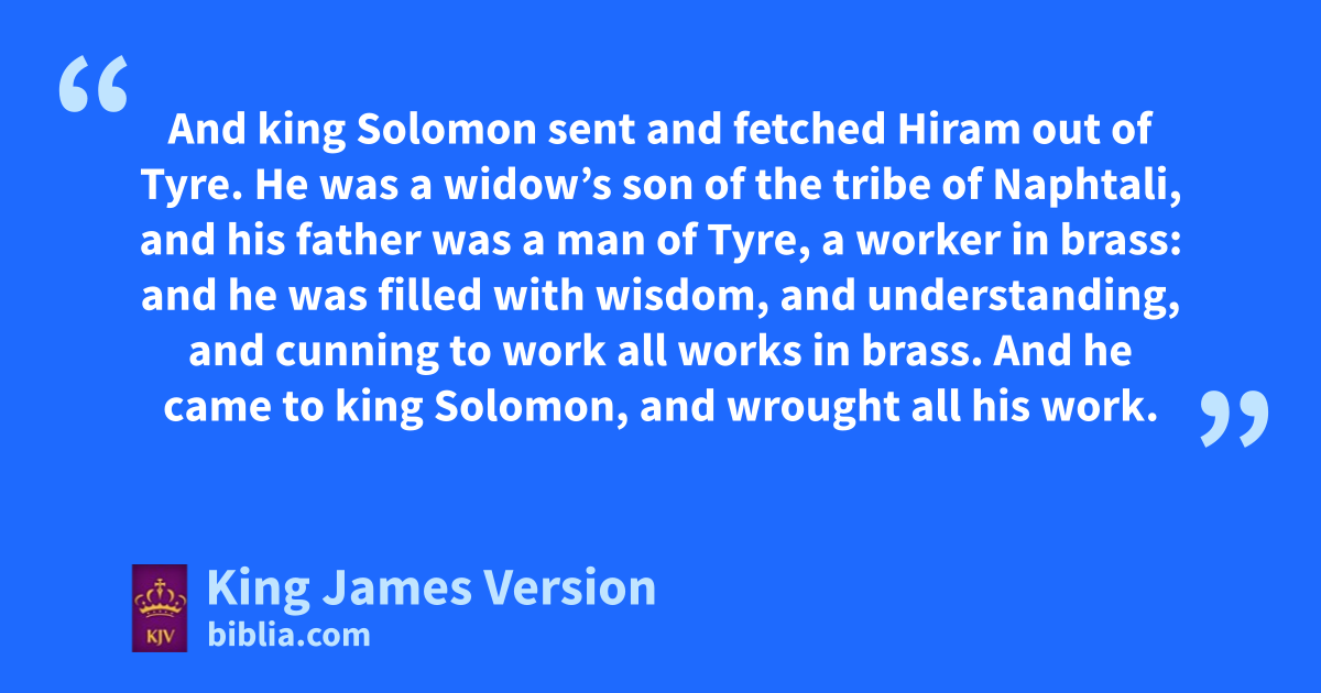 13 And king Solomon sent and fetched ||Hiram out of Tyre. 14 He was †a widow’s son fof the tribe of Naphtali, and ghis father was a man of Tyre, a worker in brass: and hhe was filled with wisdom, and understanding, and cunning to work all works in brass. And he came to king Solomon, and wrought all his work. 15 For he †cast itwo pillars of brass, of jeighteen cubits high apiece: and a line of twelve cubits did compass either of them about. 16 And he made two chapiters of molten brass, to set upon the tops of the pillars: the height of the one chapiter was five cubits, and the height of the other chapiter was five cubits: 17 And nets of checker work, and kwreaths of chain work, for the chapiters which were upon the top of the pillars; seven for the one chapiter, and seven for the other chapiter. 18 And he made the pillars, and two rows round about upon the one network, to cover the chapiters that were upon the top, with pomegranates: and so did he for the other chapiter. 19 And the chapiters that were upon the top of the pillars were of lily work in lthe porch, four cubits. 20 And the chapiters upon the two pillars had pomegranates also above, over against the belly which was by the network: and the pomegranates were mtwo hundred in rows round about upon the other chapiter. 21 And he set up the pillars in the porch of the temple: and he set up the right pillar, and called the name thereof ||Jachin: and he set up the left pillar, and called the name thereof ||Boaz. 22 And upon the top of the pillars was lily work: so was the work of the pillars finished.