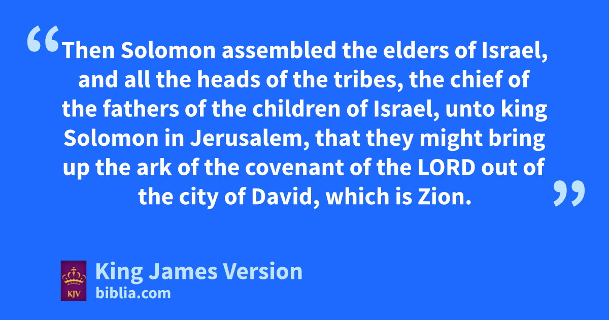 8 Then aSolomon assembled the elders of Israel, and all the heads of the tribes, the †chief of the fathers of the children of Israel, unto king Solomon in Jerusalem, bthat they might bring up the ark of the covenant of the Lord cout of the city of David, which is Zion. 2 And all the men of Israel assembled themselves unto king Solomon at the dfeast in the month Ethanim, which is the seventh month. 3 *And all the elders of Israel came, and ethe priests took up the ark. 4 And they brought up the ark of the Lord, fand the tabernacle of the congregation, and all the holy vessels that were in the tabernacle, even those did the priests and the Levites bring up. 5 And king Solomon, and all the congregation of Israel, that were assembled unto him, were with him before the ark, gsacrificing sheep and oxen, that could not be told nor numbered for multitude. 6 And the priests bbrought in the ark of the covenant of the Lord unto hhis place, into ithe oracle of the house, to the most holy place, even kunder the wings of the cherubims. 7 For the cherubims spread forth their two wings over the place of the ark, and the cherubims covered the ark and the staves thereof above. 8 And they ldrew out the staves, that the †ends of the staves were seen out in the ||holy place before ithe oracle, and they were not seen without: and there they are unto this day. 9 There was nothing in the ark save mthe two tables of stone, which Moses put there at Horeb, ||when nthe Lord made oa covenant with the children of Israel, when they came out of the land of Egypt. 10 And it came to pass, when the priests were come out of the holy place, that the cloud pfilled the house of the Lord, 11 So that the priests could not stand to minister because of the cloud: for the glory of the Lord had filled the house of the Lord.