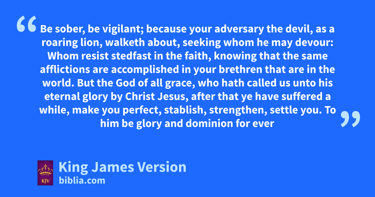 5 aThe elders which are among you I exhort, who am balso an elder, and ca witness of the sufferings of Christ, and also da partaker of the glory that shall be revealed: 2 eFeed the flock of God ||which is among you, ftaking the oversight thereof, gnot by constraint, but willingly; hnot for filthy lucre, but iof a ready mind; 3 Neither as ||kbeing lords over lGod’s heritage, but ebeing mensamples to the flock. 4 And when nthe chief Shepherd shall appear, ye shall oreceive pa crown of glory qthat fadeth not away. 5 Likewise, rye younger, submit yourselves unto athe elder. Yea, sall of you be subject one to another, and be clothed with sshumility: for tGod resisteth the proud, and giveth grace to the humble. 6 uHumble yourselves therefore under the mighty hand of God, that he may exalt you in due time: 7 vCasting all your care upon him; for whe careth for you. 8 xBe sober, ybe vigilant; because your adversary zthe devil, aas a roaring lion, bwalketh about, seeking whom he may devour: 9 cWhom resist dstedfast in the faith, knowing that ethe same afflictions fare accomplished in your gbrethren that are in the world. 10 But the God of all grace, hwho hath called us unto ihis eternal glory by Christ Jesus, after that ye have suffered ka while, lmake you perfect, mstablish, strengthen, nsettle you. 11 oTo him be glory and dominion for ever and ever. Amen.