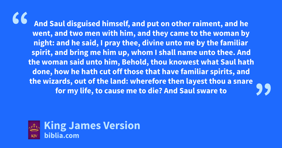 3 Now bSamuel was dead, and all Israel had lamented him, and buried him in cRamah, even in his own city. And Saul had put away dthose that had familiar spirits, and the wizards, out of the land. 4 And the Philistines gathered themselves together, and came and pitched in eShunem: and Saul gathered all Israel together, and they pitched in fGilboa. 5 And when Saul saw the host of the Philistines, he was afraid, and his heart greatly trembled. 6 And when Saul inquired of the Lord, gthe Lord answered him not, neither by hdreams, nor by iUrim, nor by prophets. 7 Then said Saul unto his servants, Seek me a woman jthat hath a familiar spirit, that I may go to her, and inquire of her. And his servants said to him, Behold, there is a woman jthat hath a familiar spirit at kEn-dor. 8 And Saul ldisguised himself, and put on other raiment, and he went, and two men with him, and they came to the woman by night: and he said, I pray thee, mdivine unto me by the familiar spirit, and bring me him up, whom I shall name unto thee. 9 And the woman said unto him, Behold, thou knowest what Saul hath done, how he hath ncut off those that have familiar spirits, and the wizards, out of the land: wherefore then layest thou a snare for my life, to cause me to die? 10 And Saul sware to her by the Lord, saying, oAs the Lord liveth, there shall no ppunishment happen to thee for this thing. 11 Then said the woman, Whom shall I bring up unto thee? And he said, Bring me up Samuel. 12 And when the woman saw Samuel, she cried with a loud voice: and the woman spake to Saul, saying, Why hast thou deceived me? for thou art Saul. 13 And the king said unto her, Be not afraid: for what sawest thou? And the woman said unto Saul, I saw qgods ascending out of the earth. 14 And he said unto her, †What form is he of? And she said, An old man cometh up; and he is covered with ra mantle. And Saul perceived that it was Samuel, and he stooped with his face to the ground, and bowed himself.