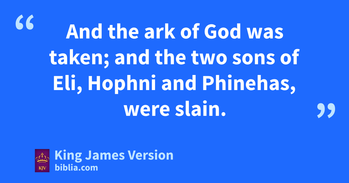 Now Israel went out against the Philistines to battle, and pitched beside aEben-ezer: and the Philistines pitched in bAphek. 2 And the Philistines put themselves in array against Israel: and when †they joined battle, Israel was smitten before the Philistines: and they slew of †the army in the field about four thousand men. 3 And when the people were come into the camp, the elders of Israel said, Wherefore hath the Lord smitten us to day before the Philistines? cLet us †fetch the ark of the covenant of the Lord out of dShiloh unto us, that, when it cometh among us, it may save us out of the hand of our enemies. 4 So the people sent to dShiloh, that they might bring from thence the ark of the covenant of the Lord of hosts, ewhich dwelleth between the cherubims: and the two sons of Eli, Hophni and Phinehas, were there with the ark of the covenant of God. 5 And when the ark of the covenant of the Lord came into the camp, all Israel fshouted with a great shout, so that the earth grang again. 6 And when the Philistines heard the noise of the shout, they said, What meaneth the noise of this great shout in the camp of the Hebrews? And they understood that the ark of the Lord was come into the camp. 7 And the Philistines were afraid, for they said, God is come into the camp. And they said, Woe unto us! for there hath not been such a thing †heretofore. 8 Woe unto us! who shall deliver us out of the hand of these mighty Gods? these are the Gods that smote the Egyptians with all the plagues in the wilderness. 9 hBe strong, and †quit yourselves like men, O ye Philistines, that ye be not servants unto the Hebrews, ias they have been to you: †quit yourselves like men, and fight. 10 And the Philistines fought, and jIsrael was smitten, and kthey fled every man into his tent: and there was a very great slaughter; for there fell of Israel thirty thousand footmen. 11 And lthe ark of God was taken; and mthe two sons of Eli, Hophni and Phinehas, †were slain.