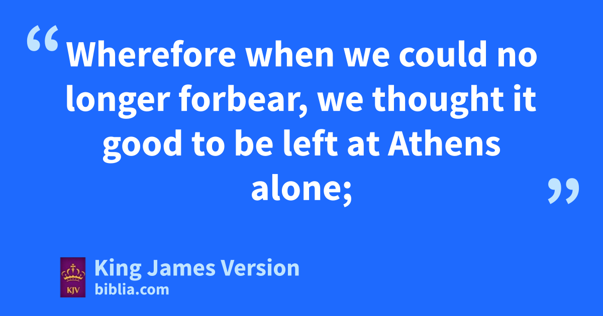 3 Wherefore awhen we could no longer bforbear, cwe thought it good to be left at Athens alone; 2 And sent cdTimotheus, ccour brother, and minister of God, and our defellowlabourer in the gospel of Christ, fto establish you, and to gcomfort you concerning your faith: 3 That no man should be moved by these afflictions: for yourselves know that hwe are appointed thereunto. 4 For verily, when we were with you, we told you before hthat we should suffer tribulation; even as iit came to pass, and ye know. 5 For this cause, awhen I could no longer forbear, I sent to know your faith, lest by some means kthe tempter lhave tempted you, and mour labour be in vain. 6 But now nwhen Timotheus came from you unto us, and brought us good tidings of oyour faith and charity, and pthat ye have good remembrance of us always, qdesiring greatly to see us, as qwe also to see you: 7 Therefore, brethren, rwe were gcomforted over you in all our affliction and sdistress by your faith: 8 For now twe live, if ye ustand fast in the Lord. 9 For wwhat thanks can we render to God again for you, for all the joy wherewith we joy for your sakes before our God; 10 xNight and day xypraying exceedingly zthat we might see your face, and amight perfect that which is lacking in your faith? 11 Now God himself band our Father, and our Lord Jesus Christ, ||cdirect our way unto you. 12 And the Lord dmake you to increase and abound ein love fone toward another, and toward all men, even as we do toward you: 13 To the end he may gstablish your hearts hunblameable in holiness before God, beven our Father, iat the coming of our Lord Jesus Christ kwith all his saints.