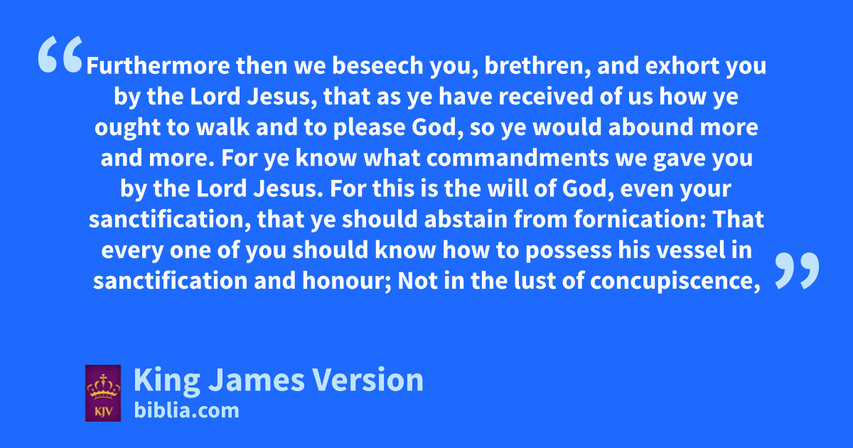 4 aFurthermore then we ||bbeseech you, brethren, and ||cexhort you by the Lord Jesus, that das ye have received of us ehow ye ought to walk and fto please God, so ye would gabound more and more. 2 For ye know dwhat commandments we gave you by the Lord Jesus. 3 For this is hthe will of God, even your isanctification, kthat ye should abstain from fornication: 4 That every one of you should know how lto possess mhis vessel in isanctification and nhonour; 5 Not in othe lust of oconcupiscence, even pas the Gentiles qwhich know not God: 6 That no man go beyond and ||defraud rhis brother ||in any matter: because that the Lord sis the avenger of all such, as we also have forewarned you and ttestified. 7 For God uhath not called us unto wuncleanness, but xunto iholiness. 8 yHe therefore that ||despiseth, despiseth not man, but God, zwho hath also given unto us his holy Spirit.