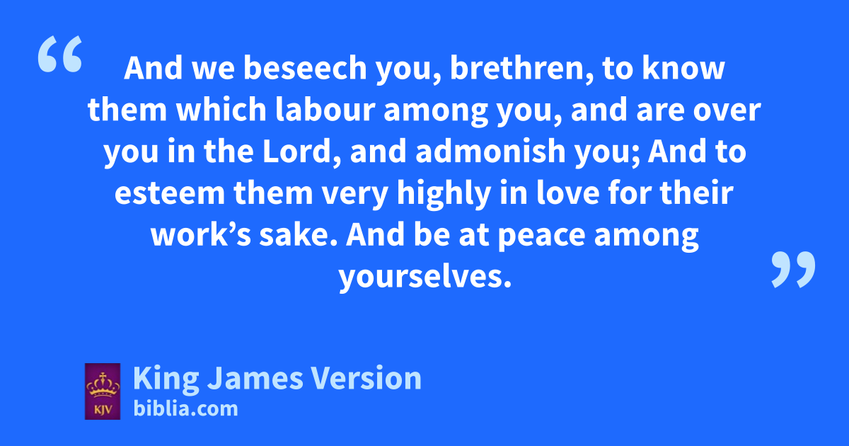 12 And we beseech you, brethren, ato know them which labour among you, and bare over you in the Lord, and cadmonish you; 13 And to esteem them very highly in love for their work’s sake. And dbe at peace among yourselves. 14 Now we ||exhort you, brethren, cwarn them that are ||unruly, ecomfort the feebleminded, fsupport the weak, gbe patient toward all men. 15 hSee that none render evil for evil unto any man; but ever ifollow that which is good, both jamong yourselves, and to all men. 16 klRejoice evermore. 17 kmPray nwithout ceasing. 18 oIn every thing give thanks: for this is pthe will of God in Christ Jesus concerning you. 19 qQuench not the Spirit. 20 Despise not rprophesyings. 21 sProve all things; hold fast that which is good. 22 tAbstain from all appearance of evil. 23 And uthe very God of peace wsanctify you wholly; and I pray God your whole xspirit and xsoul and body ybe preserved zblameless aunto the coming of our Lord Jesus Christ. 24 bFaithful is che that calleth you, who also will do it.