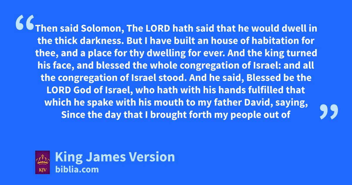 6 aThen said Solomon, The Lord hath said that he would dwell in the thick darkness. 2 But I have built an house of habitation for thee, and a bplace for thy dwelling for ever. 3 And the king turned his face, and blessed the whole congregation of Israel: and all the congregation of Israel stood. 4 And he said, Blessed be the Lord God of Israel, who hath with his hands fulfilled that which he spake with his mouth to my father David, saying, 5 Since the day that I brought forth my people out of the land of Egypt I chose no city among all the tribes of Israel to build an house in, that my name might be there; cneither chose I any man to be a ruler over my people Israel: 6 dBut I have chosen Jerusalem, that my name might be there; and have chosen David to be over my people Israel. 7 Now it was in the heart of David my father to build an house for the name of the Lord God of Israel. 8 But the Lord said to David my father, Forasmuch as it was in thine heart to build an house for my name, thou didst well in that it was in thine heart: 9 Notwithstanding thou shalt not build the house; but thy son which shall come forth out of thy loins, he shall build the house for my name. 10 The Lord therefore hath performed his word that he hath spoken: for I am risen up in the room of David my father, and am set on the throne of Israel, as the Lord promised, and have built the house for the name of the Lord God of Israel. 11 And in it have I put the ark, wherein is the covenant of the Lord, that he made with the children of Israel.