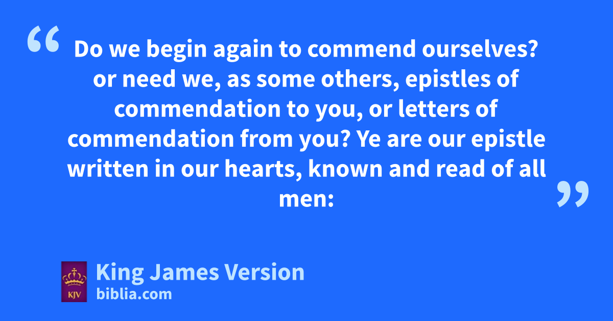 3 Do we begin again to acommend ourselves? or need we, as bsome others, cepistles of commendation to you, or letters of commendation from you? 2 dYe are our epistle written in our hearts, eknown and read of all men: 3 Forasmuch as ye are manifestly declared to be the epistle of Christ fministered by us, written not with ink, but with the Spirit of gthe living God; not in htables of stone, but iin fleshy tables of the heart. 4 And such jtrust have we through Christ to God-ward: 5 kNot that we are sufficient of ourselves to think any thing as of ourselves; but lour sufficiency is of God; 6 Who also hath made us able dmministers of nthe new nntestament; not of othe letter, but of the spirit: for pthe letter killeth, but qthe spirit ||giveth life. 7 But if pthe ministration of death, hwritten and engraven in stones, rwas glorious, rso that the children of Israel could not sstedfastly behold the face of Moses for tthe glory of his countenance; which glory was to be udone away: 8 How shall not the ministration of the spirit be rather glorious? 9 For if vthe ministration of condemnation be glory, much more doth wthe ministration of righteousness exceed in glory. 10 For even that which was made glorious xhad no glory yin this respect, by reason of the glory that excelleth. 11 For if that which is udone away was glorious, much more that which remaineth is glorious. 12 Seeing then that we have such hope, zwe use great ||plainness of speech: 13 And not as Moses, rwhich put a vail over his face, that the children of Israel could not sstedfastly look to athe end of that which is uabolished: 14 But btheir cminds were dblinded: for until this day remaineth the same vail untaken away ein the reading of fthe old testament; which vail is udone away in Christ. 15 But even unto this day, ewhen Moses is read, the vail is upon their heart. 16 Nevertheless gwhen it shall turn to the Lord, hthe vail shall be taken away. 17 Now ithe Lord is that Spirit: and where the Spirit of the Lord is, jthere is liberty. 18 But we all, with open face kbeholding as in a glass lthe glory of the Lord, mare nchanged into the same image ofrom glory to glory, even as ||by the Spirit of the Lord.