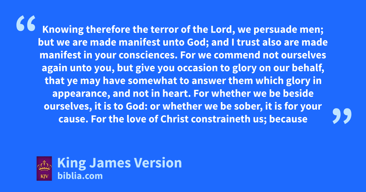9 Wherefore we ||labour, that, whether present or absent, we may be paccepted of him. 10 For we must all appear qbefore the judgment seat of Christ; rthat every one may receive the things done in his body, according to that he hath done, whether it be good or bad. 11 Knowing therefore sthe terror of the Lord, we persuade men; but twe are made manifest unto God; and I trust also are tmade manifest in your consciences. 12 For we ucommend not ourselves vagain unto you, but give you woccasion xto glory on our behalf, that ye may have somewhat to answer them which glory †in appearance, and not in heart. 13 For whether we be ybeside ourselves, it is to God: or whether we zbe sober, it is for your cause. 14 For athe love of Christ constraineth us; because we thus judge, that bif one died for all, then were all dead: 15 And that he died for all, cthat they which live should not henceforth live unto themselves, but unto him which died for them, and rose again. 16 Wherefore henceforth dknow we no man eafter the flesh: yea, though we have known Christ eafter the flesh, yet now henceforth fknow we him no more. 17 Therefore if any man be gin Christ, ||he is ha new creature: iold things are passed away; behold, all things are become new. 18 And all things are of God, kwho hath reconciled us to himself by Jesus Christ, and hath given to us lthe ministry of mreconciliation; 19 To wit, that nGod was in Christ, kreconciling nnthe world unto himself, not oimputing their trespasses unto them; and hath †committed unto us the word of mreconciliation. 20 Now then pwe are ambassadors for Christ, as qthough God did beseech you by us: we pray you in Christ’s stead, kbe ye reconciled to God. 21 For rhe hath made him to be sin for us, who knew no sin; that we might be made sthe righteousness of God in him.