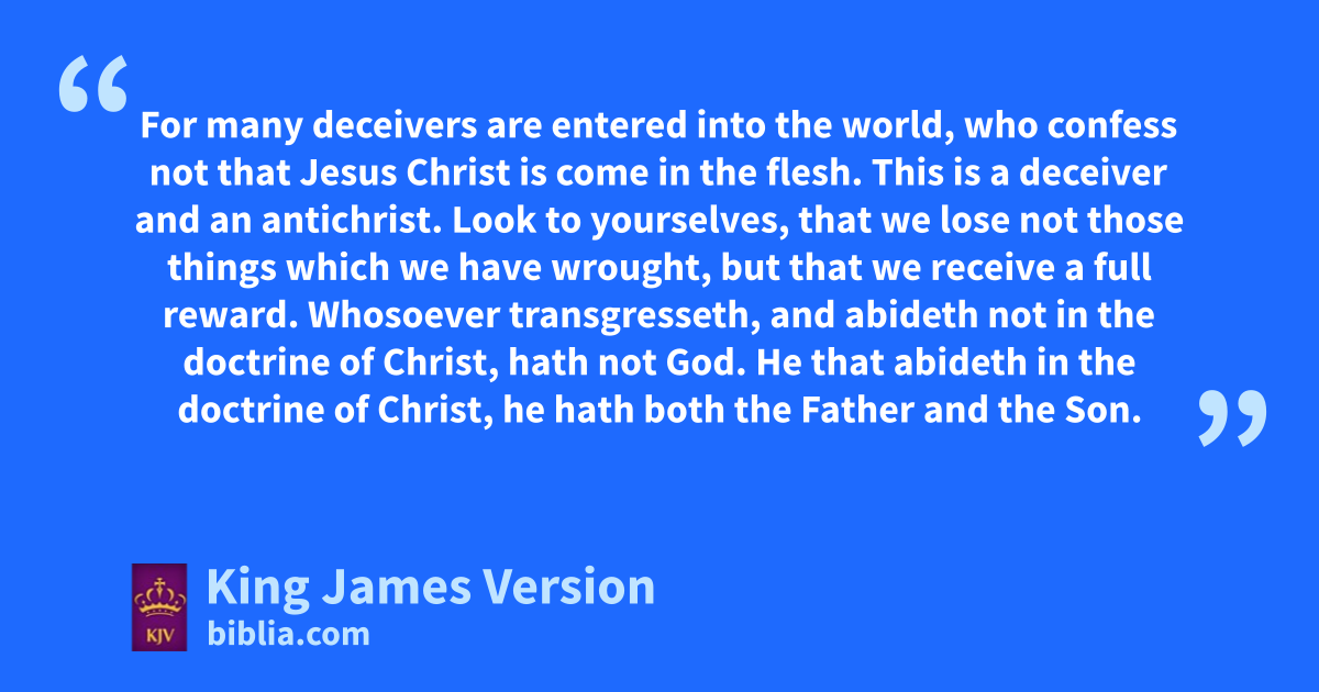 *aThe elder unto bthe elect lady and her children, cwhom I love in the truth; and not I only, but also all they that have dknown ethe truth; 2 ffor the truth’s sake, which dwelleth in us, and shall be with us for ever. 3 ghGrace †be with you, gmercy, and ghpeace, from God the Father, and from the Lord Jesus Christ, the Son of the Father, cin truth and love. 4 I rejoiced greatly that I found of thy children iwalking in truth, as we have received a commandment from the Father. 5 And now I beseech thee, lady, knot as though I wrote a new commandment unto thee, but kthat which we had from the beginning, kthat we love one another. 6 And lthis is love, that we walk after his commandments. This is the commandment, That, mas ye have heard from the beginning, ye should walk in it. 7 For nmany deceivers are entered into the world, owho confess not that Jesus Christ is come in the flesh. oThis is pa deceiver and an nantichrist. 8 qLook to yourselves, rthat we lose not those things which we have ||rrwrought, but that swe receive a full reward. 9 Whosoever ttransgresseth, and abideth not in the doctrine of Christ, uhath not God. He that abideth in the doctrine of Christ, he uhath both the Father and the Son. 10 If there come any unto you, and bring not this doctrine, vreceive him not into your house, vneither bid him God speed: 11 for he that biddeth him God speed wis partaker of his evil deeds.