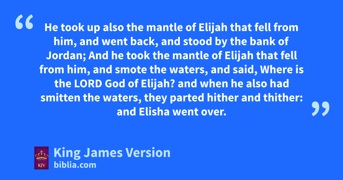 2 And it came to pass, when the Lord would atake up Elijah into heaven by a whirlwind, that Elijah went with bElisha from cGilgal. 2 And Elijah said unto Elisha, dTarry here, I pray thee; for the Lord hath sent me to eBeth-el. And Elisha said unto him, fAs the Lord liveth, and as thy soul liveth, I will not leave thee. So they went down to Beth-el. 3 And gthe sons of the prophets that were at Beth-el came forth to Elisha, and said unto him, Knowest thou that the Lord will take away thy master hfrom thy head to day? And he said, Yea, I know it; hold ye your peace. 4 And Elijah said unto him, Elisha, tarry here, I pray thee; for the Lord hath sent me to iJericho. And he said, fAs the Lord liveth, and as thy soul liveth, I will not leave thee. So they came to Jericho. 5 And the sons of the prophets that were at Jericho came to Elisha, and said unto him, Knowest thou that the Lord will take away thy master hfrom thy head to day? And he answered, Yea, I know it; hold ye your peace. 6 And Elijah said unto him, Tarry, I pray thee, here; for the Lord hath sent me to Jordan. And he said, fAs the Lord liveth, and as thy soul liveth, I will not leave thee. And they two went on. 7 And fifty men of the sons of the prophets went, and stood †to view afar off: and they two stood by Jordan. 8 And Elijah took khis mantle, and wrapped it together, and smote the waters, and mthey were divided hither and thither, so that they two went over on dry ground. 9 And it came to pass, when they were gone over, that Elijah said unto Elisha, Ask what I shall do for thee, before I be taken away from thee. And Elisha said, I pray thee, let na double portion of thy spirit be upon me. 10 And he said, †Thou hast asked a hard thing: nevertheless, if thou see me when I am taken from thee, it shall be so unto thee; but if not, it shall not be so. 11 And it came to pass, as they still went on, and talked, that, behold, there appeared oa chariot of fire, and horses of fire, and parted them both asunder; and pElijah went up by a whirlwind into heaven. 12 And Elisha saw it, and he cried, qMy father, my father, the chariot of Israel, and the horsemen thereof. And he saw him no more: and he took hold of his own clothes, and rrent them in two pieces. 13 He took up also the mantle of Elijah that fell from him, and went back, and stood by the †bank of Jordan; 14 And he took the mantle of Elijah that fell from him, and smote the waters, and said, Where is the Lord God of Elijah? and when he also had smitten the waters, sthey parted hither and thither: and Elisha went over. 15 And when the sons of the prophets which were tto view at Jericho saw him, they said, The spirit of Elijah doth rest on Elisha. And they came to meet him, and bowed themselves to the ground before him. 16 And they said unto him, Behold now, there be with thy servants fifty †strong men; let them go, we pray thee, and seek thy master: lest peradventure uthe Spirit of the Lord hath taken him up, and cast him upon †some mountain, or into some valley. And he said, Ye shall not send. 17 And when they urged him xtill he was ashamed, he said, Send. They sent therefore fifty men; and they sought three days, but found him not. 18 And when they came again to him, (for he tarried at Jericho,) he said unto them, Did I not say unto you, Go not?