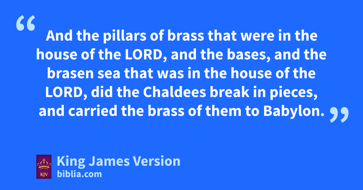 8 And in the pfifth month, on the qseventh day of the month, which is rthe nineteenth year of king Nebuchadnezzar king of Babylon, came Nebuzar-adan, ||captain of the guard, a servant of the king of Babylon, unto Jerusalem: 9 And she burnt the house of the Lord, and the king’s house, and tall the houses of Jerusalem, and every great man’s house burnt he with fire. 10 And all the army of the Chaldees, that were uwith the captain of the guard, wbrake down the walls of Jerusalem round about. 11 Now xthe rest of the people that were left in the city, and the †fugitives that fell away to the king of Babylon, with the remnant of the multitude, did Nebuzar-adan the captain of the guard carry away. 12 But the captain of the guard left yof the poor of the land to be vinedressers and husbandmen. 13 zAnd athe pillars of brass that were in the house of the Lord, and bthe bases, and cthe brasen sea that was in the house of the Lord, did the Chaldees break in pieces, and carried the brass of them to Babylon. 14 And dthe pots, and dthe shovels, and ethe snuffers, and fthe spoons, and all the vessels of brass wherewith they ministered, took they away. 15 And dthe firepans, and dthe bowls, and such things as were of gold, in gold, and of silver, in silver, the captain of the guard took away. 16 gThe two pillars, †one sea, and hthe bases which Solomon had made for the house of the Lord; ithe brass of all these vessels was without weight. 17 kThe height of the one pillar was eighteen cubits, and the chapiter upon it was brass: and the height of the chapiter lthree cubits; and the wreathen work, and pomegranates upon the chapiter round about, all of brass: and like unto these had the second pillar with wreathen work. 18 And the captain of the guard took mSeraiah nthe chief priest, and oZephaniah pthe second priest, and the three keepers of the †door: 19 And out of the city he took an ||officer that was set over the men of war, and qfive men of them that †were in the king’s presence, which were found in the city, and the ||principal scribe of the host, which mustered the people of the land, and threescore men of the people of the land that were found in the city: 20 And Nebuzar-adan captain of the guard took these, and brought them to the king of Babylon to rRiblah: 21 And the king of Babylon smote them, and slew them at rRiblah in the land of Hamath. sSo Judah was carried away out of their land.