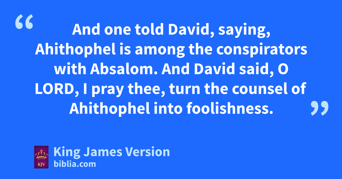 30 And David went up by the ascent of mount Olivet, †and wept as he went up, and lhad his head covered, and he went mbarefoot: and all the people that was with him covered every man his head, and they went up, nweeping as they went up. 31 And one told David, saying, Ahithophel is among the conspirators with Absalom. And David said, O Lord, I pray thee, oturn the counsel of Ahithophel into foolishness. 32 And it came to pass, that when David was come to the top of the mount, where he worshipped God, behold, Hushai the pArchite came to meet him qwith his coat rent, and rearth upon his head: 33 Unto whom David said, If thou passest on with me, then thou shalt be sa burden unto me: 34 But if thou return to the city, and say unto Absalom, tI will be thy servant, O king; as I have been thy father’s servant hitherto, so will I now also be thy servant: then mayest thou for me udefeat the counsel of Ahithophel. 35 And hast thou not there with thee Zadok and Abiathar the priests? therefore it shall be, that what thing soever thou shalt hear out of the king’s house, vthou shalt tell it to Zadok and Abiathar the priests. 36 Behold, they have there xwith them their two sons, Ahimaaz Zadok’s son, and Jonathan Abiathar’s son; and by them ye shall send unto me every thing that ye can hear. 37 So yHushai David’s friend came into the city, zand Absalom came into Jerusalem.