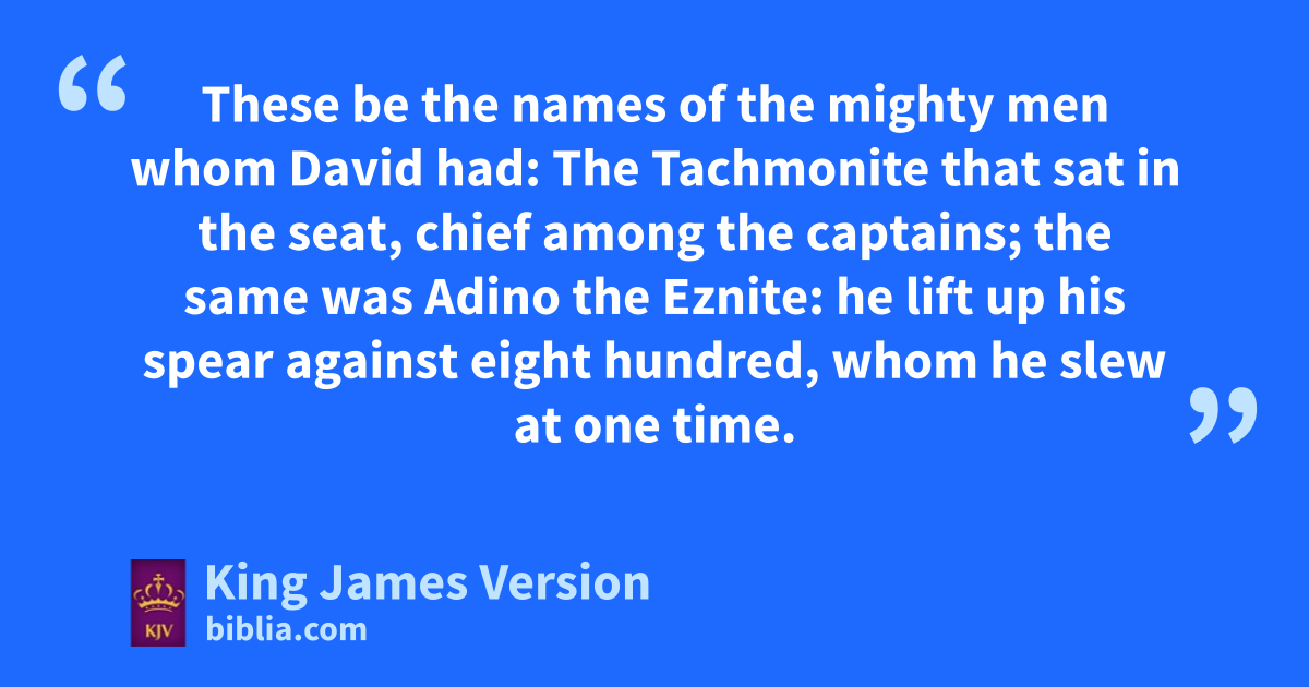 8 lThese be the names of the mighty men whom David had: ||The Tachmonite that sat in the seat, chief among mthe captains; the same was Adino the Eznite: ||he lift up his spear against eight hundred, †whom he slew at one time. 9 And after him was nEleazar the son of Dodo the Ahohite, one of the three mighty men with David, when othey defied the Philistines that were there gathered together to battle, and the men of Israel were gone away: 10 He arose, and smote the Philistines until his hand was weary, and his hand clave unto the sword: and the Lord wrought a great pvictory that day; and the people returned after him only to spoil. 11 And after him was qShammah the son of Agee the Hararite. And the Philistines were gathered together ||into a troop, where was a piece of ground full of lentiles: and the people fled from the Philistines. 12 But he stood in the midst of the ground, and defended it, and slew the Philistines: and the Lord wrought a great pvictory. 13 And ||three of the thirty chief went down, and came to David in the harvest time unto rthe cave of Adullam: and the troop of the Philistines pitched in sthe valley of Rephaim. 14 And David was then in tan hold, and uthe garrison of the Philistines was then in Beth-lehem. 15 And David longed, and said, Oh that one would give me drink of the water of the well of Beth-lehem, which is by the gate! 16 And the three mighty men brake through the host of the Philistines, and drew water out of the well of Beth-lehem, that was by the gate, and took it, and brought it to David: nevertheless he would not drink thereof, but poured it out unto the Lord. 17 And he said, Be it far from me, O Lord, that I should do this: is not this wthe blood of the men that went in jeopardy of their lives? therefore he would not drink it. These things did these three mighty men. 18 And Abishai, the brother of Joab, the son of Zeruiah, was chief among three. And he lifted up his spear against three hundred, †and slew them, and had the name among three. 19 Was he not most honourable of three? therefore he was their captain: howbeit he attained not unto the xfirst three. 20 And yBenaiah the son of Jehoiada, the son of a valiant man, of zKabzeel, †who had done many acts, he slew two †lionlike men of aMoab: he went down also and slew a lion in the midst of a pit in time of snow: 21 And he slew an Egyptian, †a goodly man: and the Egyptian had a spear in his hand; but he went down to him with a staff, and plucked the spear out of the Egyptian’s hand, and slew him with his own spear. 22 These things did Benaiah the son of Jehoiada, and had the name among three mighty men. 23 He was ||more honourable than the thirty, but he attained not to the bfirst three. And David set him over his ||guard.
